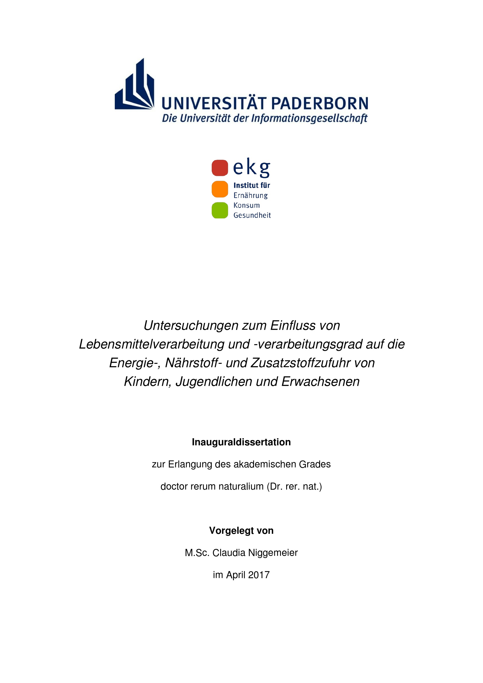 Untersuchungen zum Einfluss von Lebensmittelverarbeitung und -verarbeitungsgrad auf die Energie-, Nährstoff- und Zusatzstoffzufuhr von Kindern, Jugendlichen und Erwachsenen / vorgelegt von M.Sc. Claudia Niggemeier