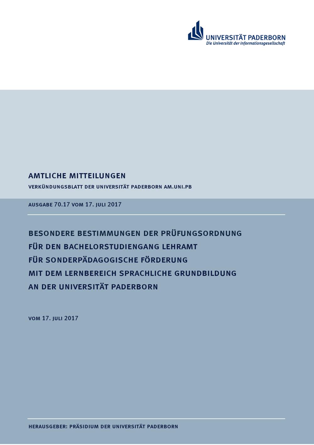 Besondere Bestimmungen der Prüfungsordnung für den Bachelorstudiengang Lehramt für Sonderpädagogische Förderung mit dem Lernbereich Sprachliche Grundbildung an der Universität Paderborn : vom 17. Juli 2017