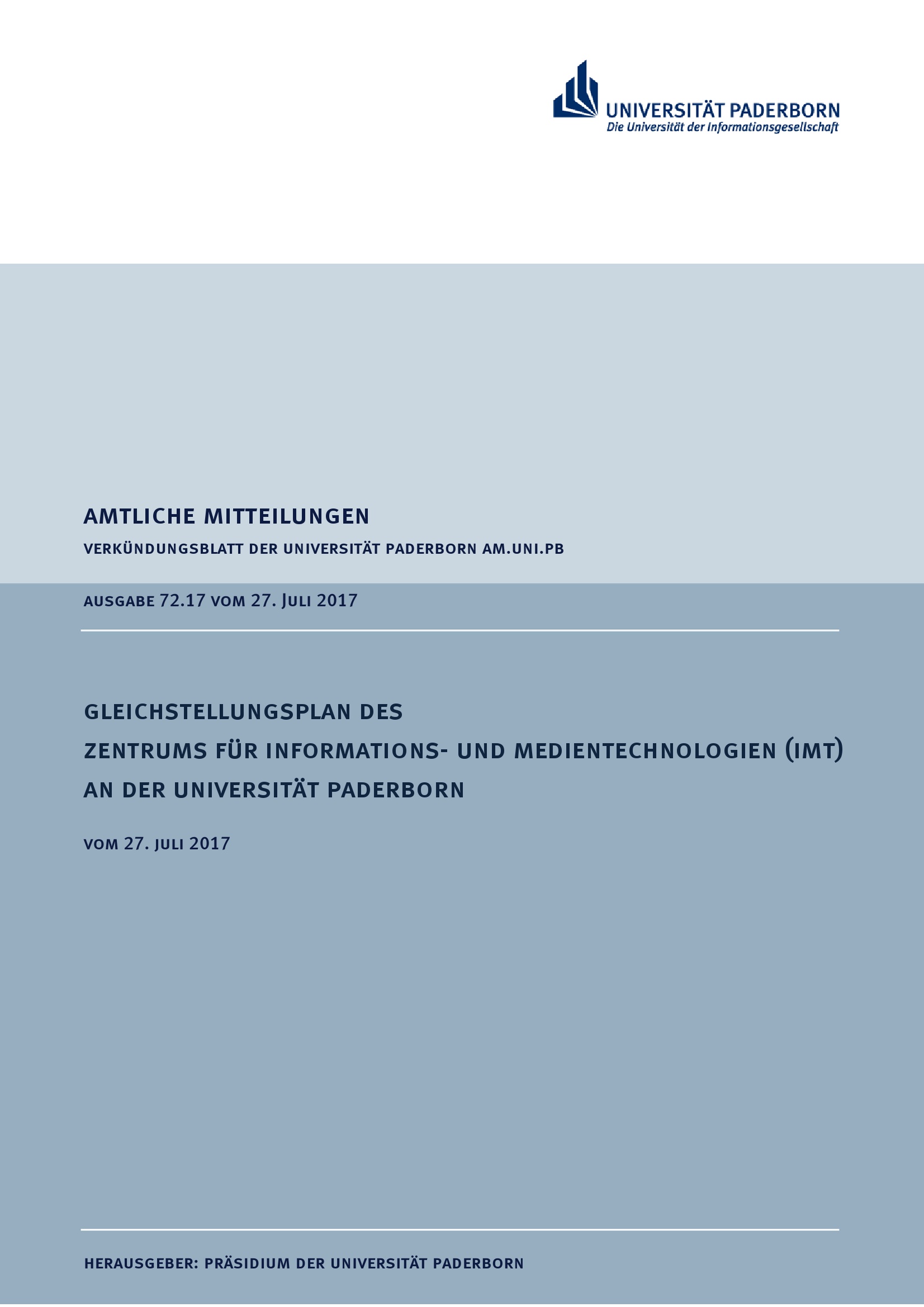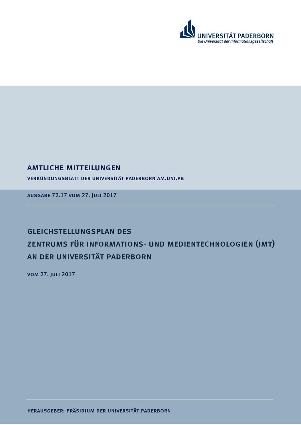 Gleichstellungsplan des Zentrums für Informations- und Medientechnologien (IMT) an der Universität Paderborn : vom 27. Juli 2017