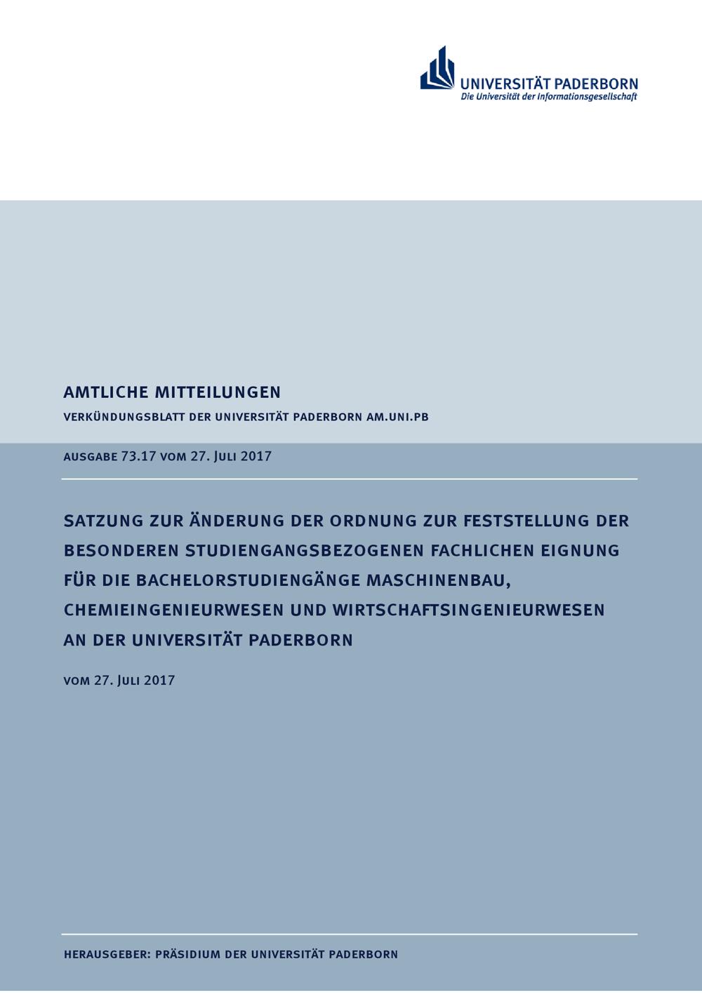 Satzung zur Änderung der Ordnung zur Feststellung der besonderen studiengangsbezogenen fachlichen Eignung für die Bachelorstudiengänge Maschinenbau, Chemieingenieurwesen und Wirtschaftsingenieurwesen an der Universität Paderborn : vom 27. Juli 2017