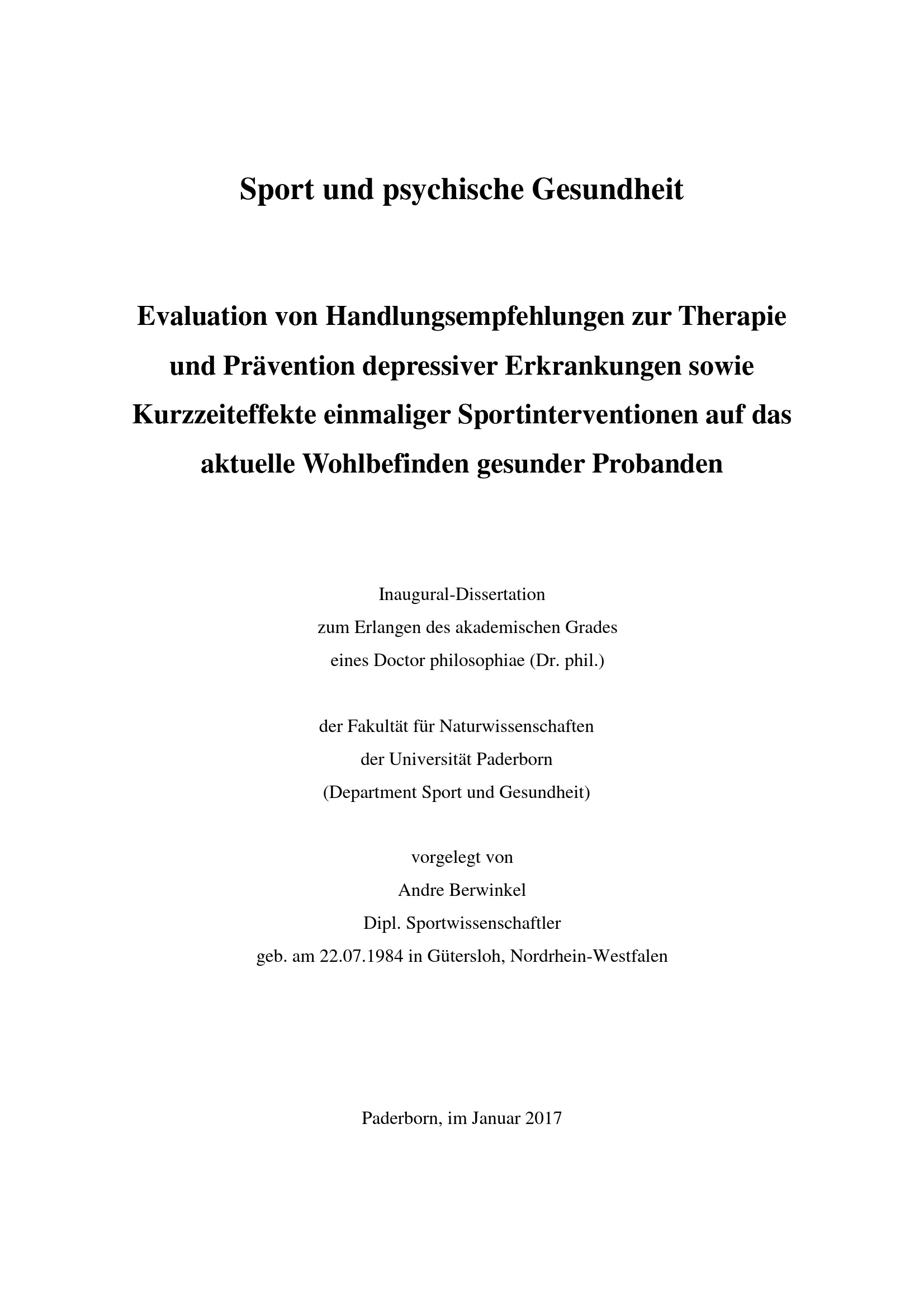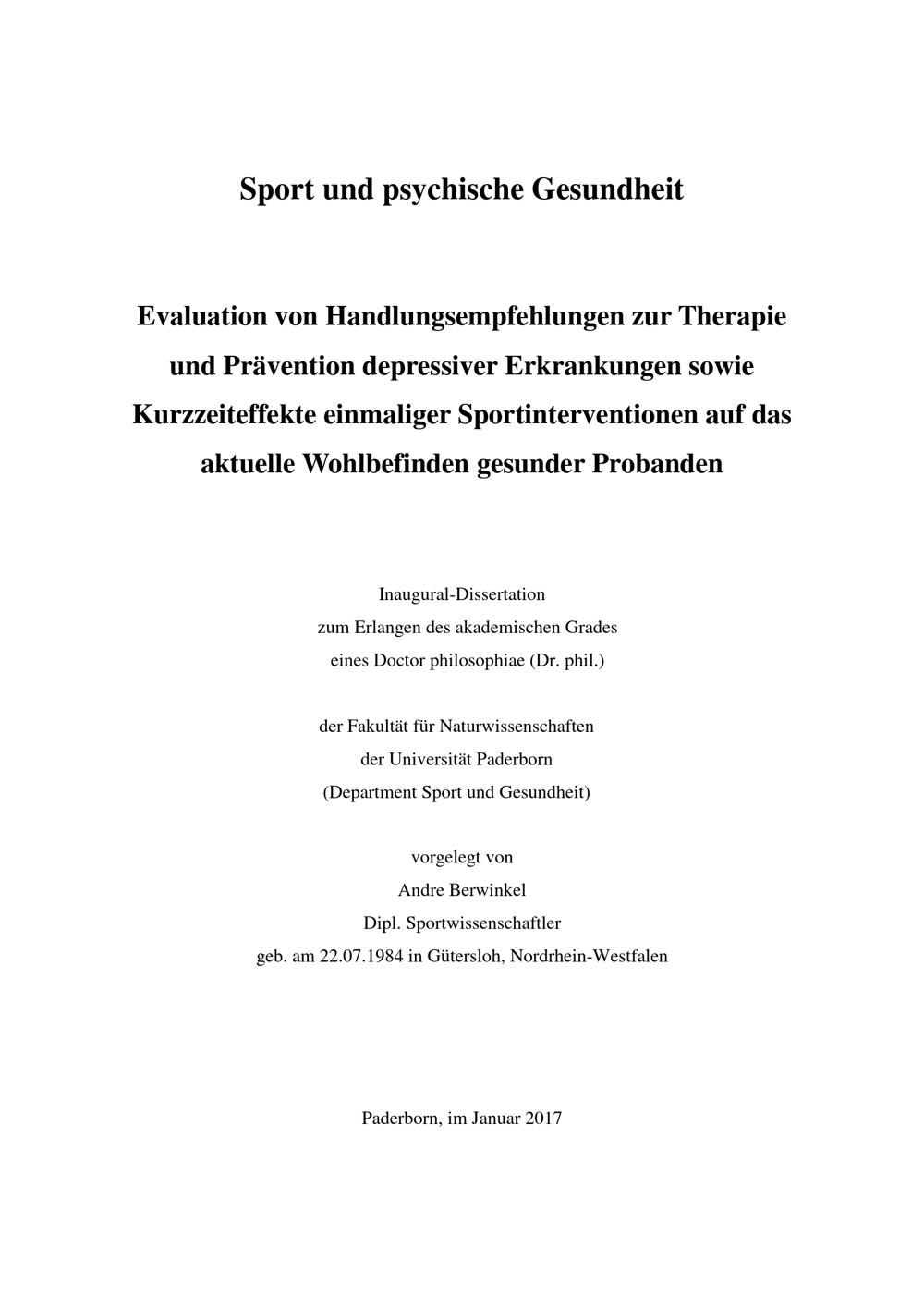 Sport und psychische Gesundheit : Evaluation von Handlungsempfehlungen zur Therapie und Prävention depressiver Erkrankungen sowie Kurzzeiteffekte einmaliger Sportinterventionen auf das aktuelle Wohlbefinden gesunder Probanden / vorgelegt von Andre Berwinkel ; [1. Gutachter: Prof. Dr. Matthias Weigelt, Universität Paderborn, 2. Gutachter: Prof. Dr. Martin Driessen, Evangelisches Krankenhaus Bielefeld, 3. Gutachter: Prof. Dr. Katrin B. Klingsieck, Universität Paderborn]