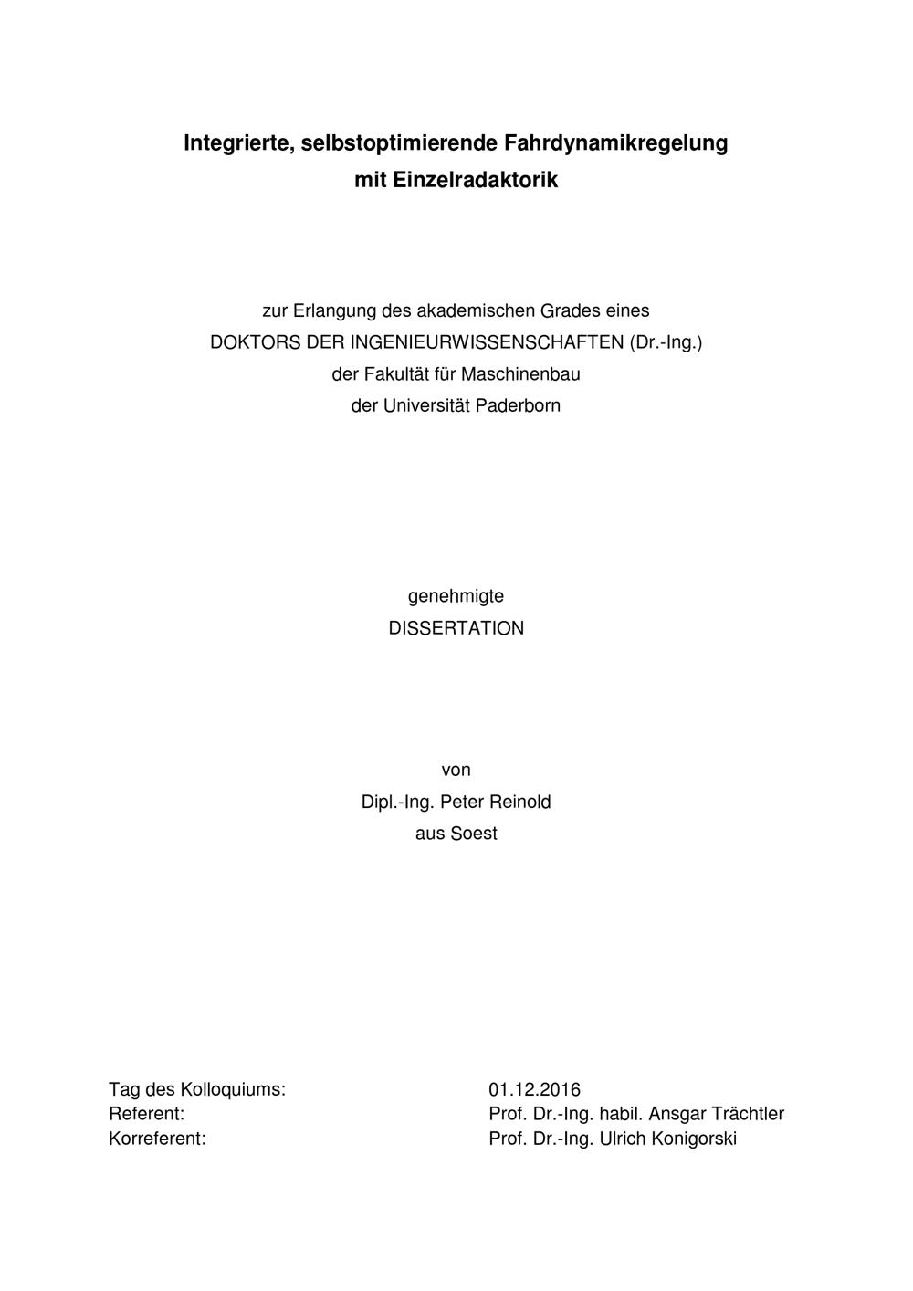 Integrierte, selbstoptimierende Fahrdynamikregelung mit Einzelradaktorik / von Dipl.-Ing. Peter Reinold ; Referent: Prof. Dr.-Ing. habil. Ansgar Trächtler, Korreferent: Prof. Dr.-Ing. Ulrich Konigorski