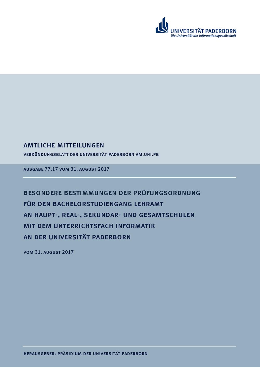 Besondere Bestimmungen der Prüfungsordnung für den Bachelorstudiengang Lehramt an Haupt-, Real-, Sekundar- undGesamtschulen mit dem Unterrichtsfach Informatik an der Universität Paderborn : vom 31. August 2017