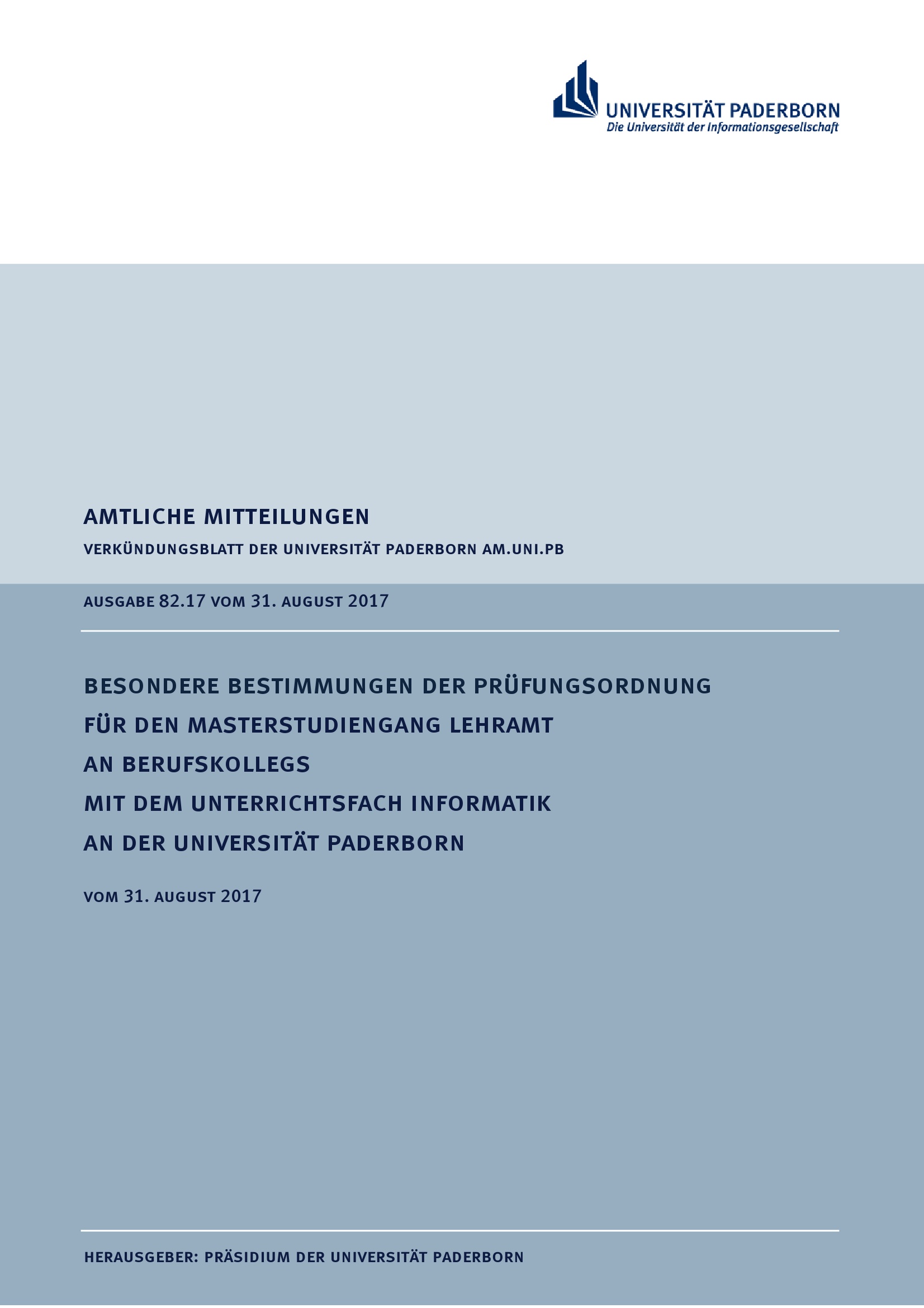 Besondere Bestimmungen der Prüfungsordnung für den Masterstudiengang Lehramt an Berufskollegs mit dem Unterrichtsfach Informatik an der Universität Paderborn : vom 31. August 2017