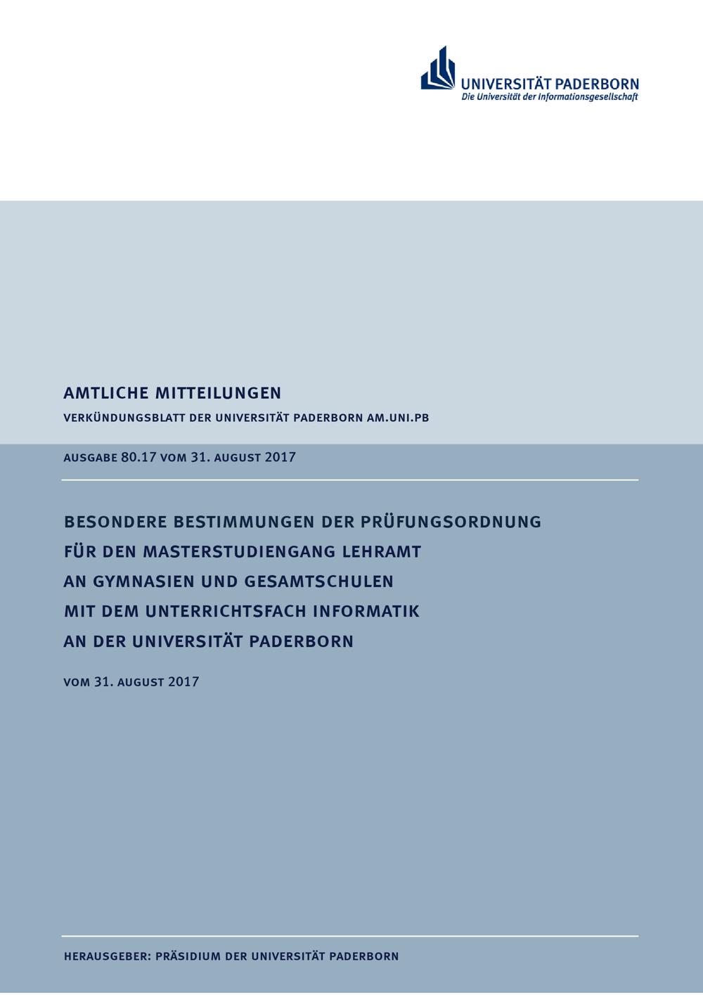 Besondere Bestimmungen der Prüfungsordnung für den Masterstudiengang Lehramt an Gymnasien und Gesamtschulen mit dem Unterrichtsfach Informatik an der Universität Paderborn : vom 31. August 2017