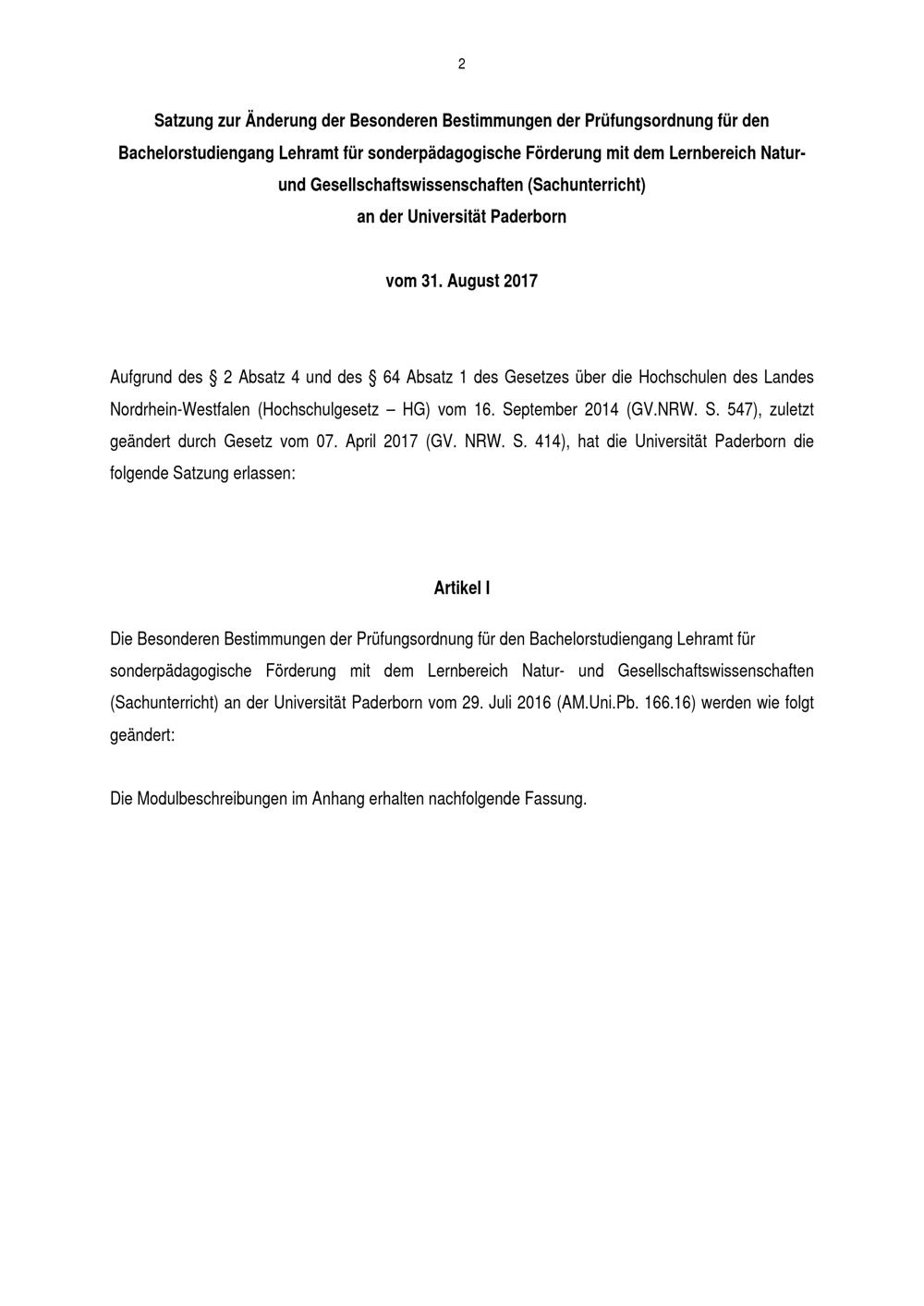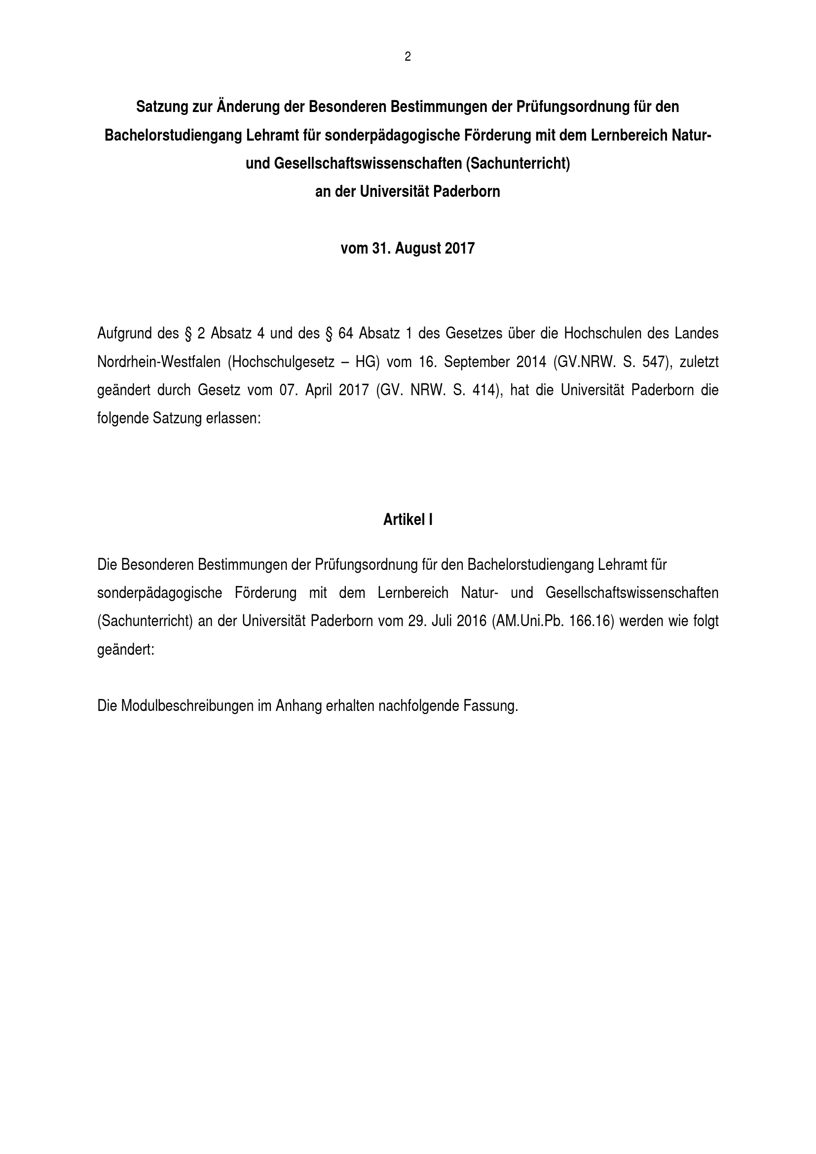 Satzung zur Änderung der Besonderen Bestimmungen der Prüfungsordnung für den Bachelorstudiengang Lehramt für sonderpädagogische Förderung mit dem Lernbereich Natur- und Gesellschaftswissenschaften (Sachunterricht) an der Universität Paderborn : vom 31. August 2017