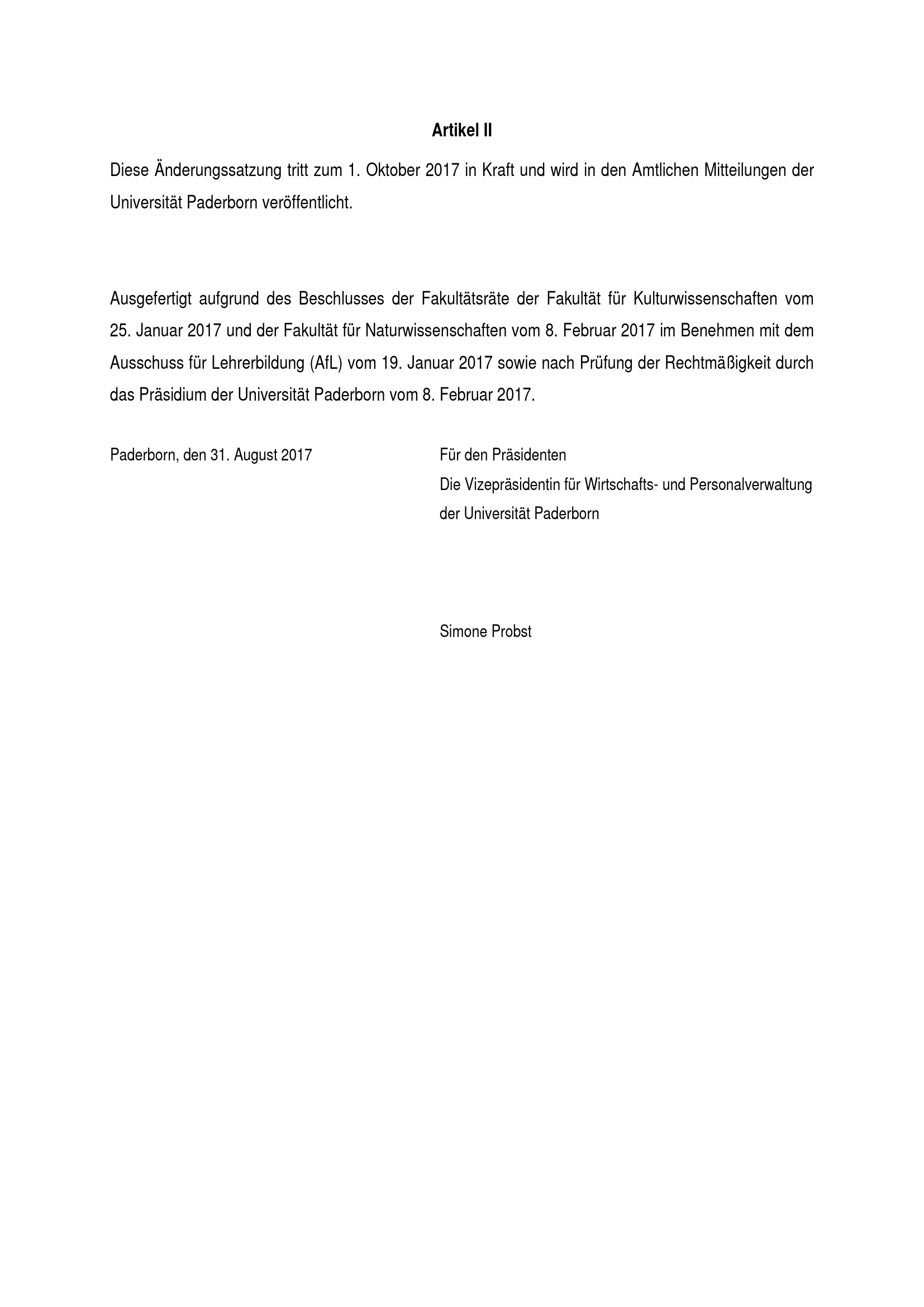 Satzung zur Änderung der Besonderen Bestimmungen der Prüfungsordnung für den Bachelorstudiengang Lehramt für sonderpädagogische Förderung mit dem Lernbereich Natur- und Gesellschaftswissenschaften (Sachunterricht) an der Universität Paderborn : vom 31. August 2017
