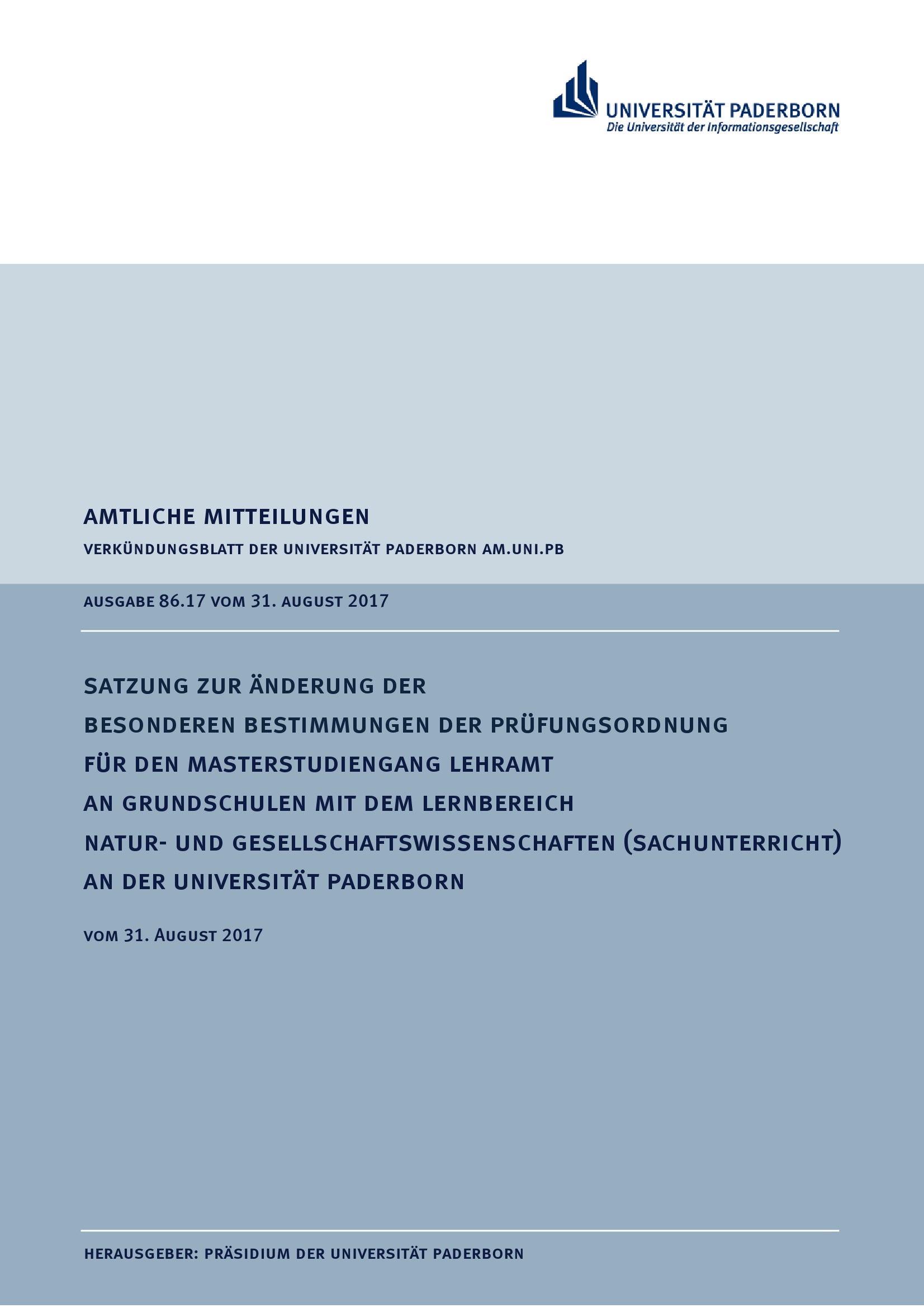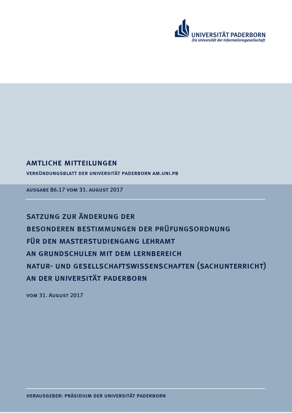 Satzung zur Änderung der Besonderen Bestimmungen der Prüfungsordnung für den Masterstudiengang Lehramt an Grundschulen mit dem Lernbereich Natur- und Gesellschaftswissenschaften (Sachunterricht) an der Universität Paderborn : vom 31. August 2017
