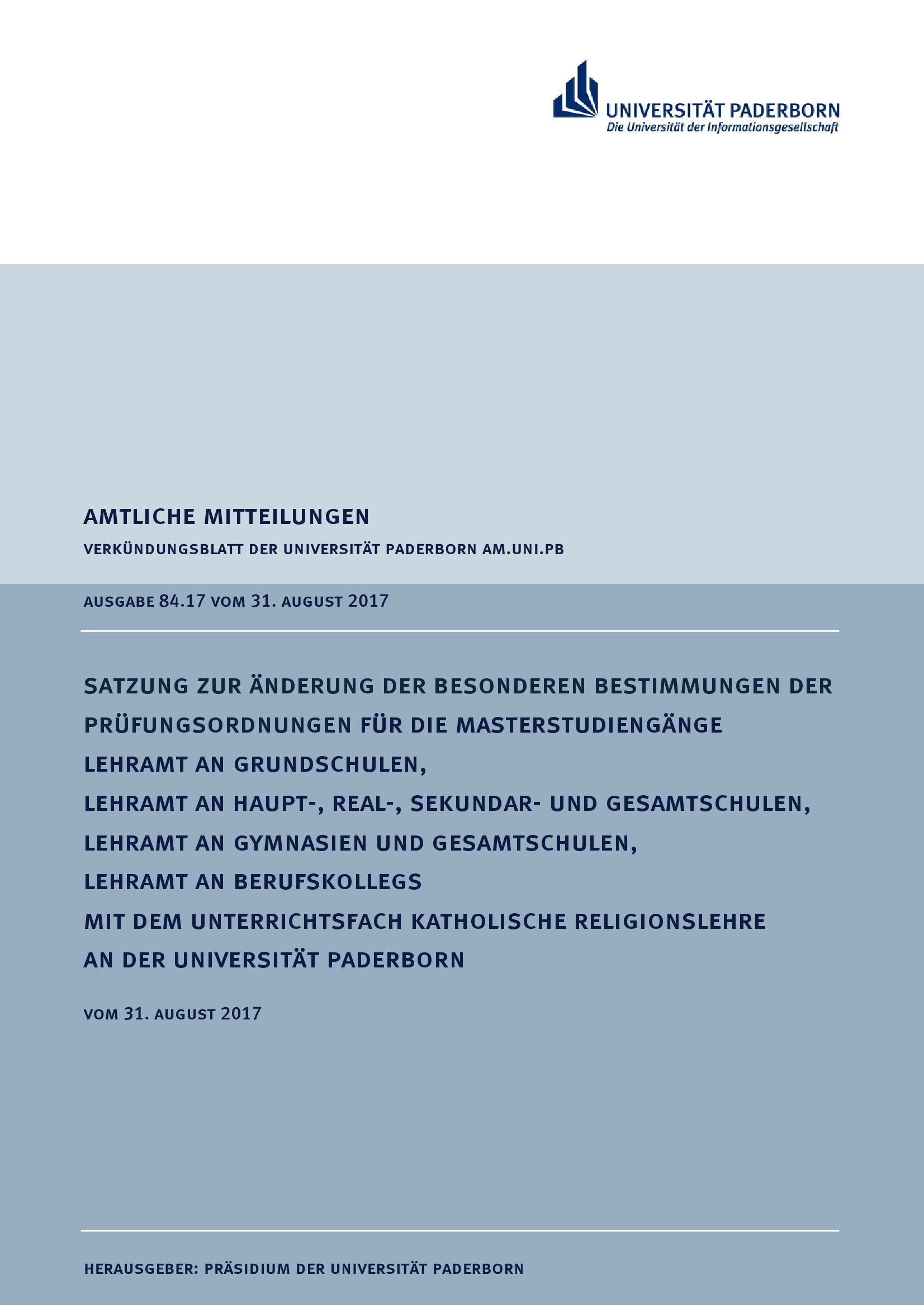 Satzung zur Änderung der Besonderen Bestimmungen der Prüfungsordnungen für die Masterstudiengänge Lehramt an Grundschulen, Lehramt an Haupt-, Real-, Sekundar- und Gesamtschulen, Lehramt an Gymnasien und Gesamtschulen, Lehramt an Berufskollegs mit dem Unterrichtsfach Katholische Religionslehre an der Universität Paderborn : vom 31. August 2017
