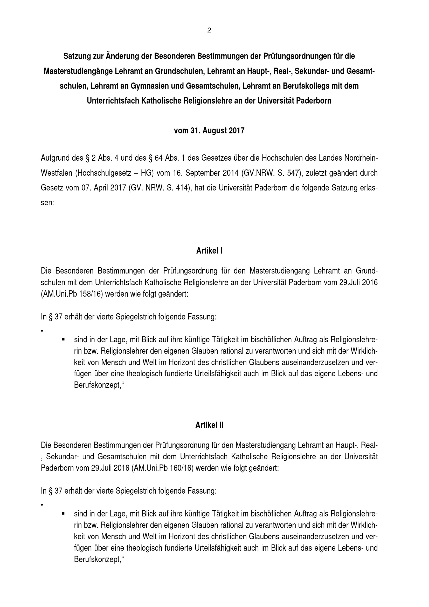 Satzung zur Änderung der Besonderen Bestimmungen der Prüfungsordnungen für die Masterstudiengänge Lehramt an Grundschulen, Lehramt an Haupt-, Real-, Sekundar- und Gesamtschulen, Lehramt an Gymnasien und Gesamtschulen, Lehramt an Berufskollegs mit dem Unterrichtsfach Katholische Religionslehre an der Universität Paderborn : vom 31. August 2017