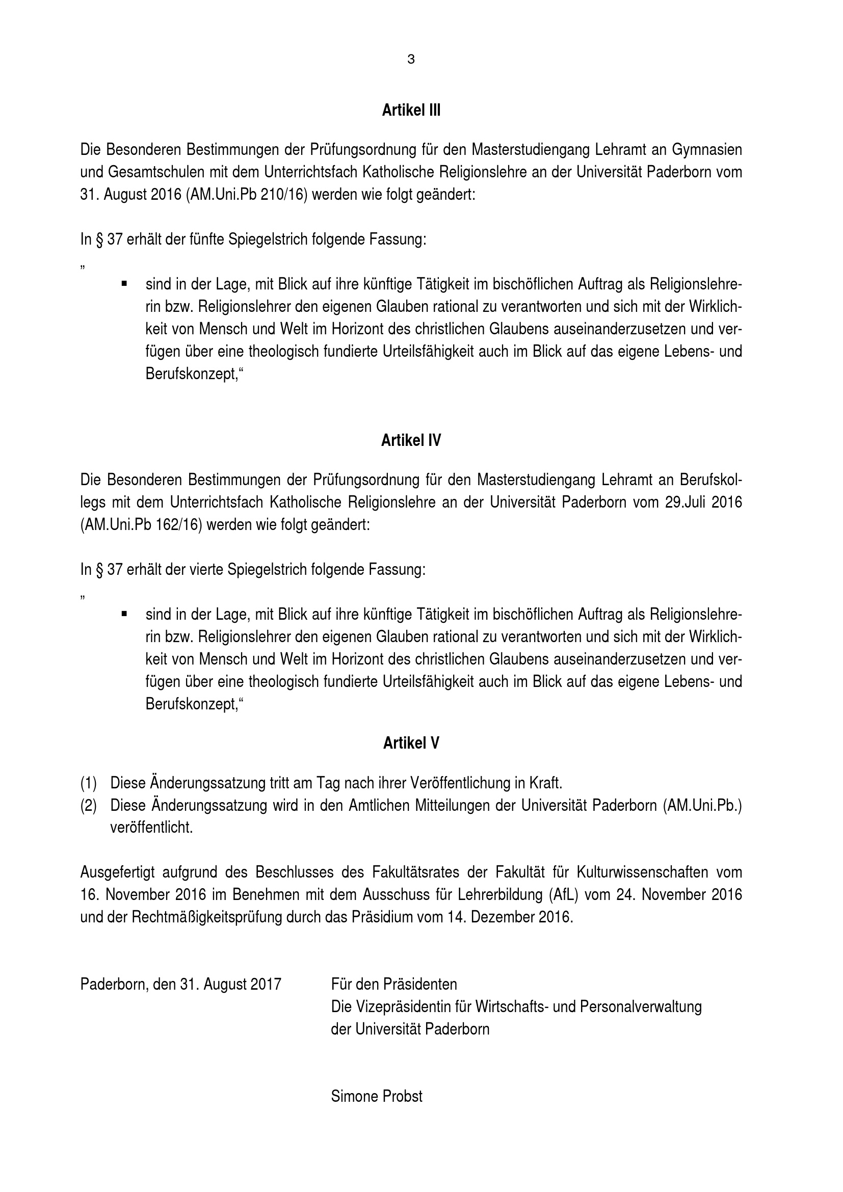 Satzung zur Änderung der Besonderen Bestimmungen der Prüfungsordnungen für die Masterstudiengänge Lehramt an Grundschulen, Lehramt an Haupt-, Real-, Sekundar- und Gesamtschulen, Lehramt an Gymnasien und Gesamtschulen, Lehramt an Berufskollegs mit dem Unterrichtsfach Katholische Religionslehre an der Universität Paderborn : vom 31. August 2017