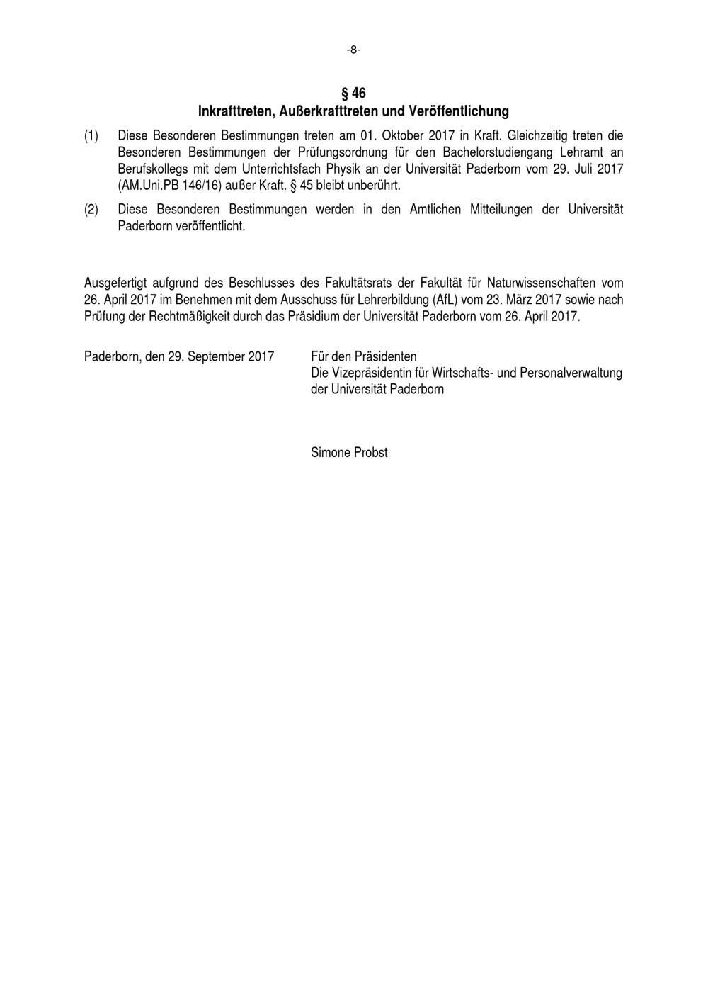 Besondere Bestimmungen der Prüfungsordnung für den Bachelorstudiengang Lehramt an Berufskollegs mit dem Unterrichtsfach Physik an der Universität Paderborn : vom 29. September 2017