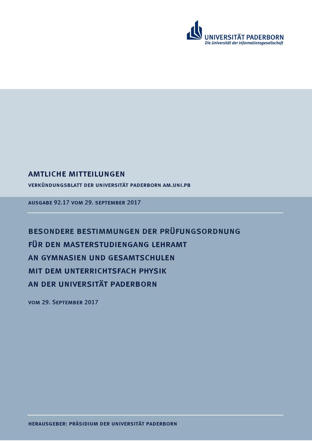 Besondere Bestimmungen der Prüfungsordnung für den Masterstudiengang Lehramt an Gymnasien und Gesamtschulen mit dem Unterrichtsfach Physik an der Universität Paderborn : vom 29. September 2017