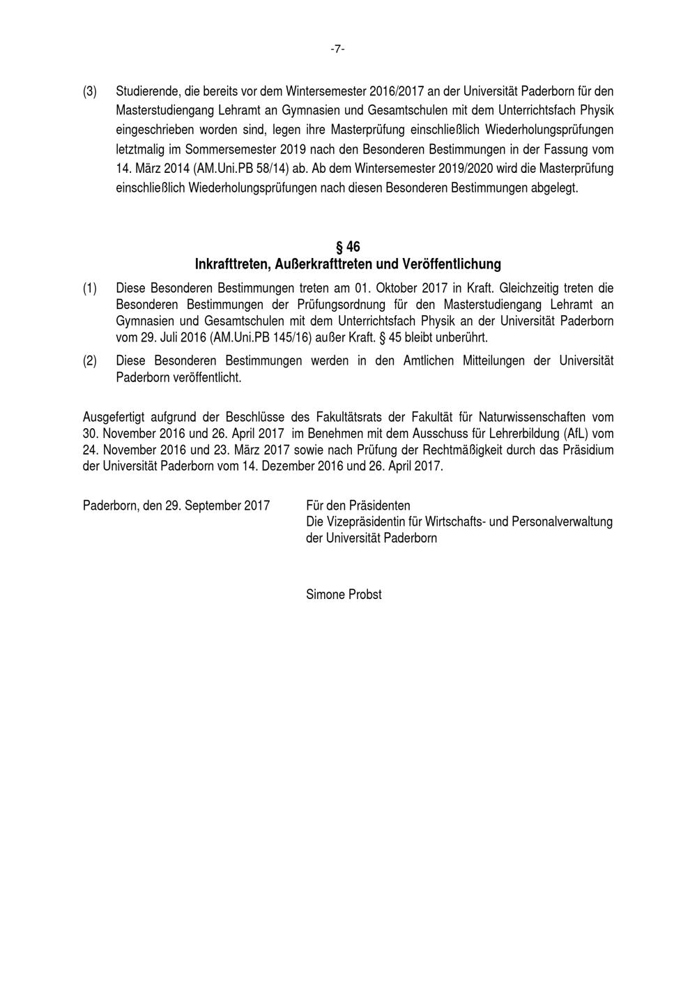Besondere Bestimmungen der Prüfungsordnung für den Masterstudiengang Lehramt an Gymnasien und Gesamtschulen mit dem Unterrichtsfach Physik an der Universität Paderborn : vom 29. September 2017