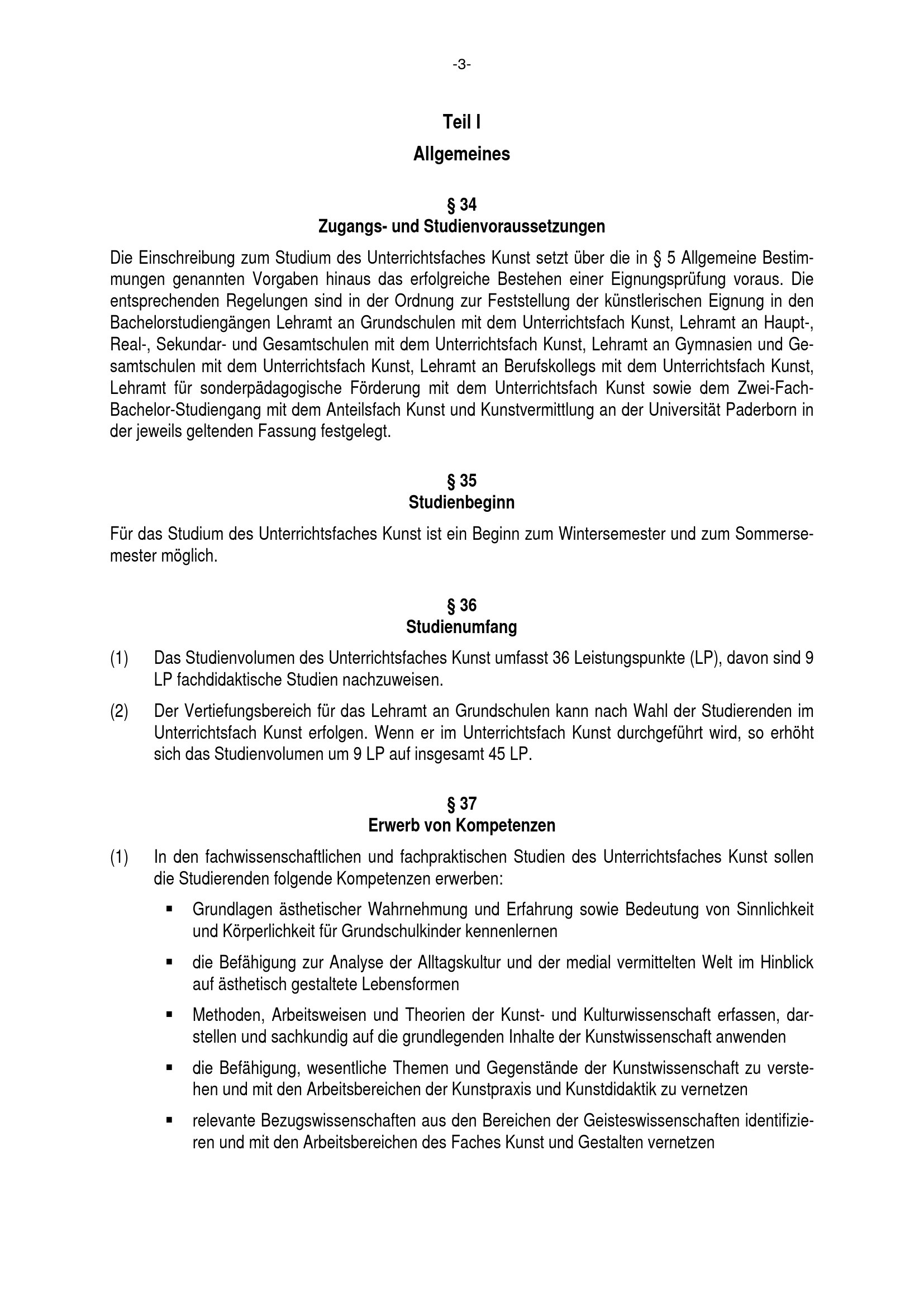 Besondere Bestimmungen der Prüfungsordnung für den Bachelorstudiengang Lehramt an Grundschulen mit dem Unterrichtsfach Kunst an der Universität Paderborn : vom 29. September 2017