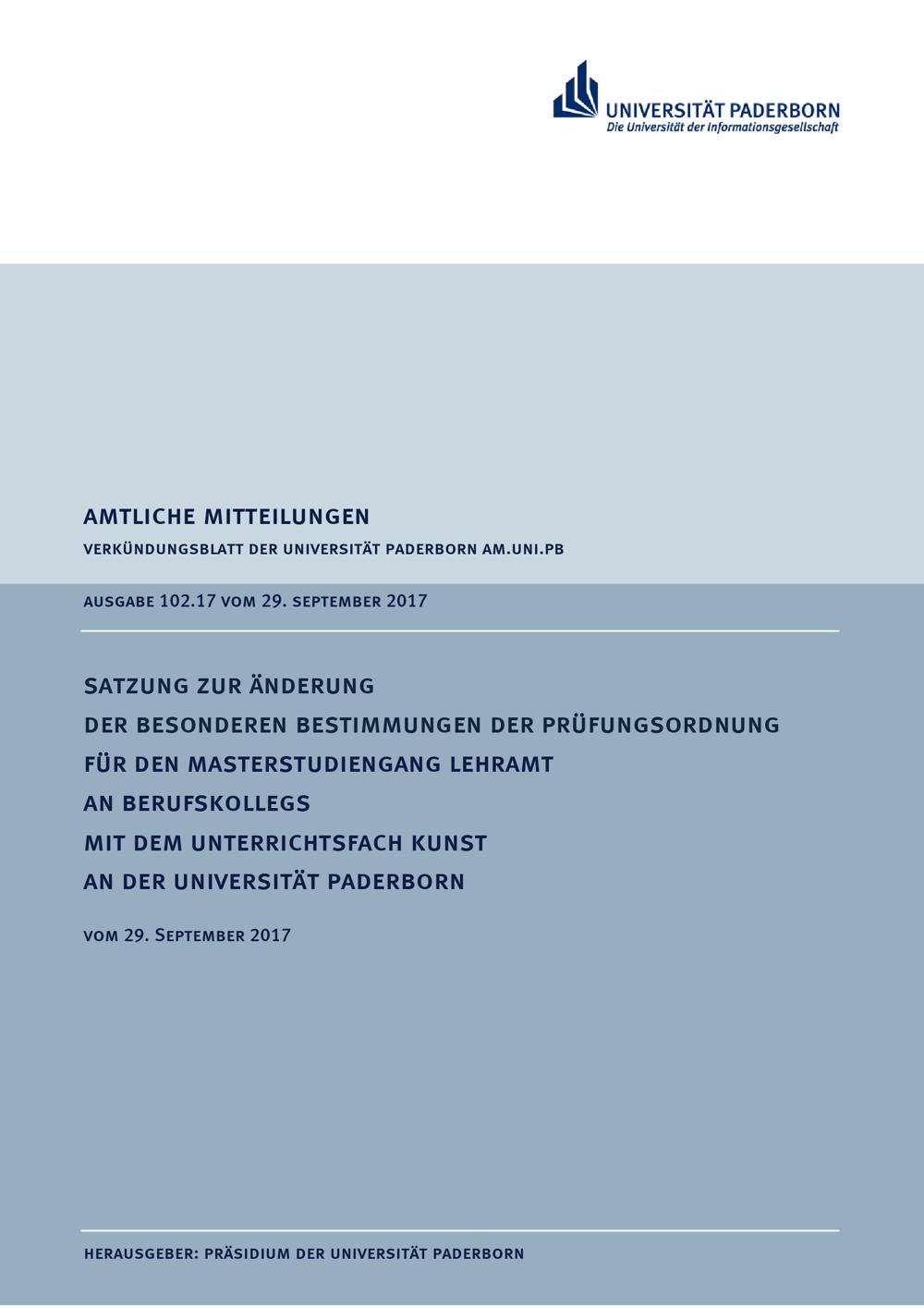 Satzung zur Änderung der Besonderen Bestimmungen der Prüfungsordnung für den Masterstudiengang Lehramt an Berufskollegs mit dem Unterrichtsfach Kunst an der Universität Paderborn : vom 29. September 2017