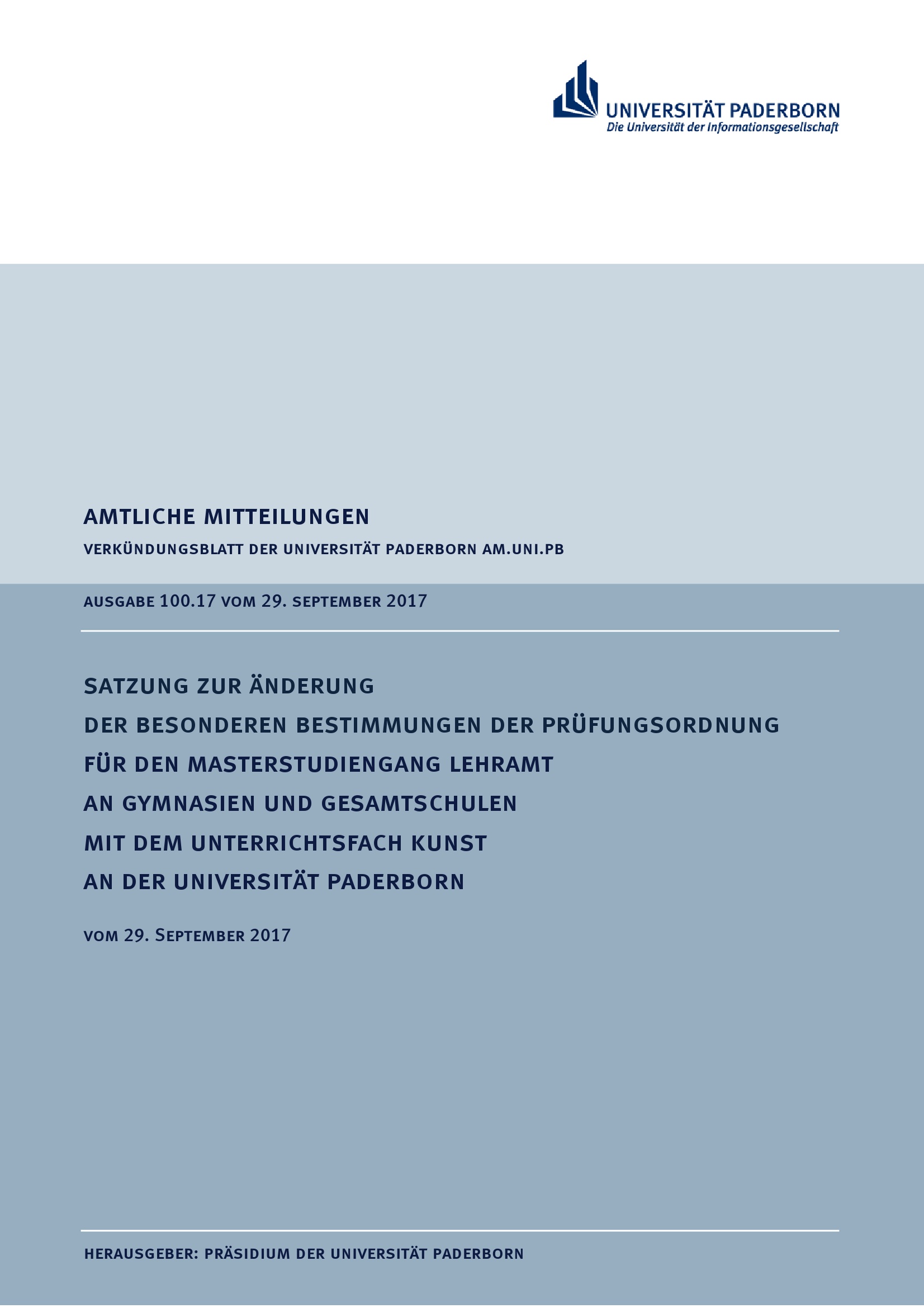 Satzung zur Änderung der Besonderen Bestimmungen der Prüfungsordnung für den Masterstudiengang Lehramt an Gymnasien und Gesamtschulen mit dem Unterrichtsfach Kunst an der Universität Paderborn : vom 29. September 2017