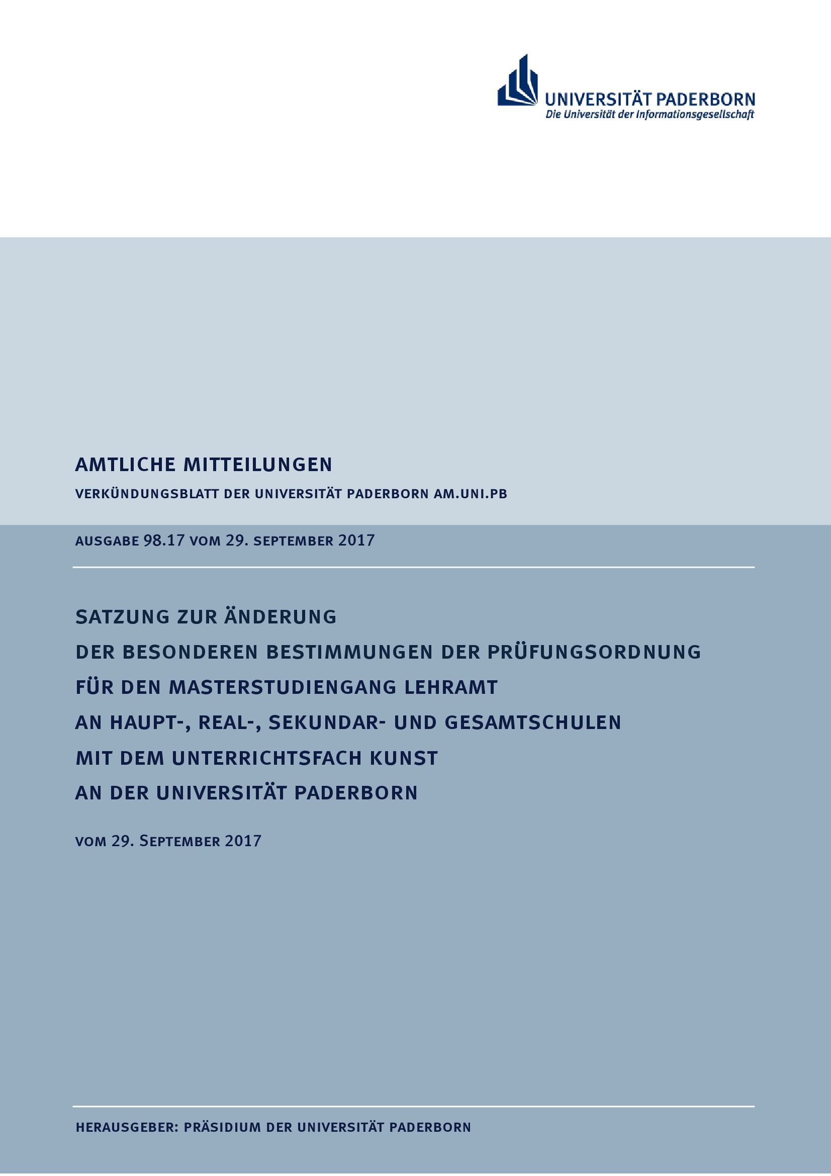 Satzung zur Änderung der Besonderen Bestimmungen der Prüfungsordnung für den Masterstudiengang Lehramt an Haupt-, Real-, Sekundar- und Gesamtschulen mit dem Unterrichtsfach Kunst an der Universität Paderborn : vom 29. September 2017