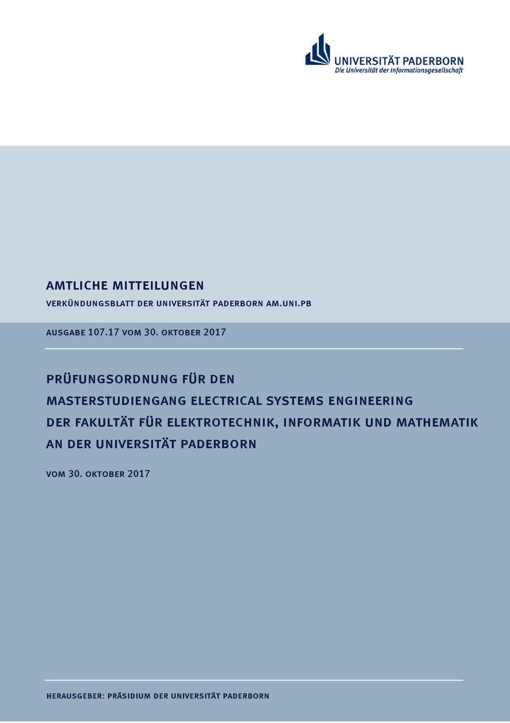 Prüfungsordnung für den Masterstudiengang Electrical Systems Engineering der Fakultät für Elektrotechnik, Informatik und Mathematik an der Universität Paderborn : vom 30. Oktober 2017