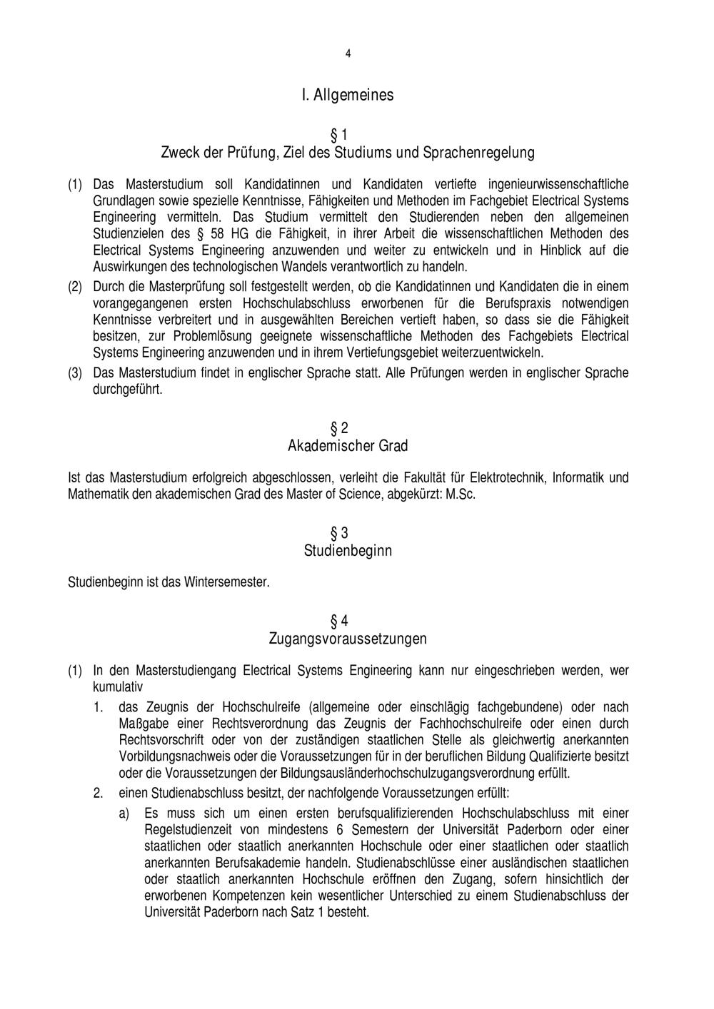 Prüfungsordnung für den Masterstudiengang Electrical Systems Engineering der Fakultät für Elektrotechnik, Informatik und Mathematik an der Universität Paderborn : vom 30. Oktober 2017