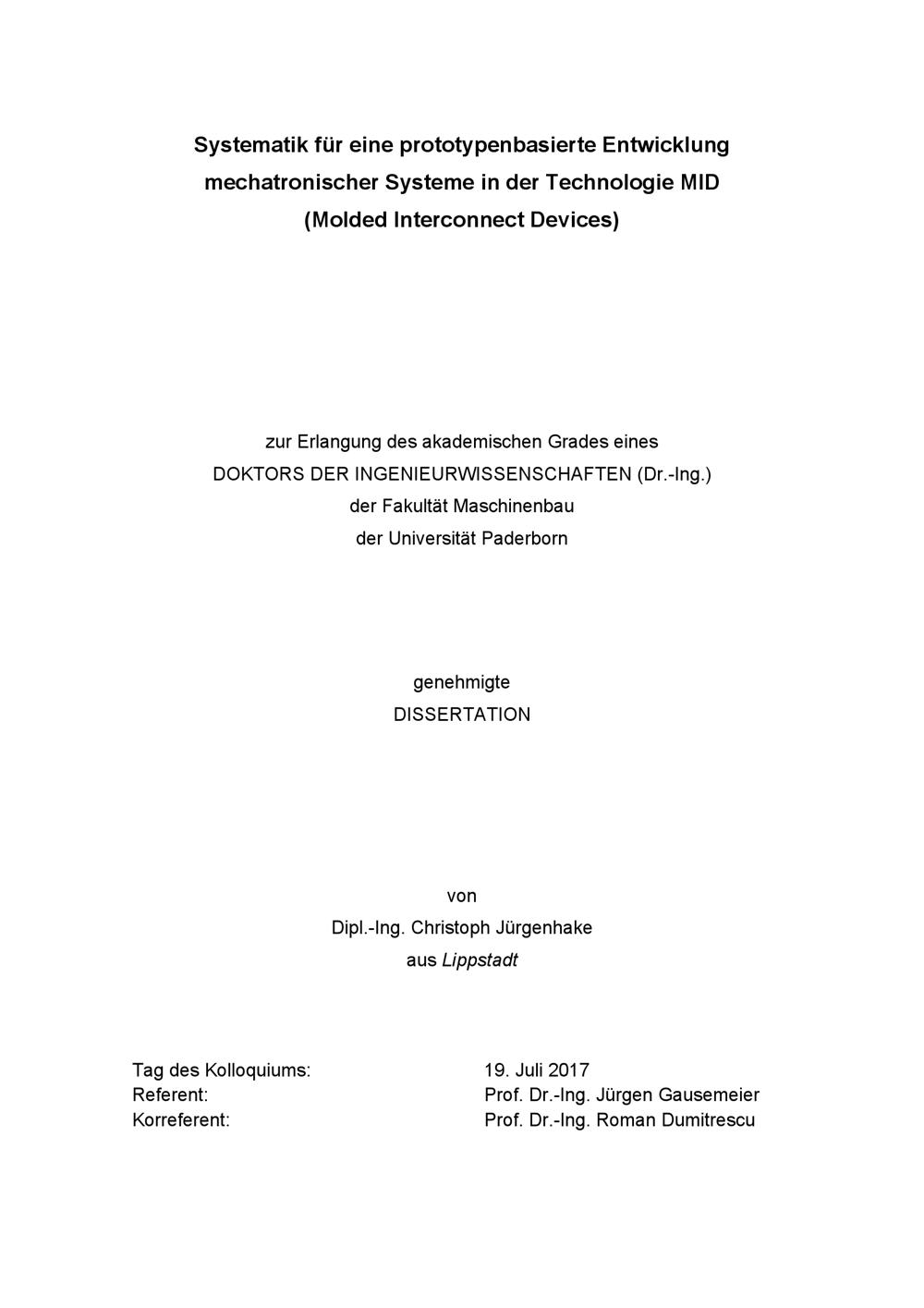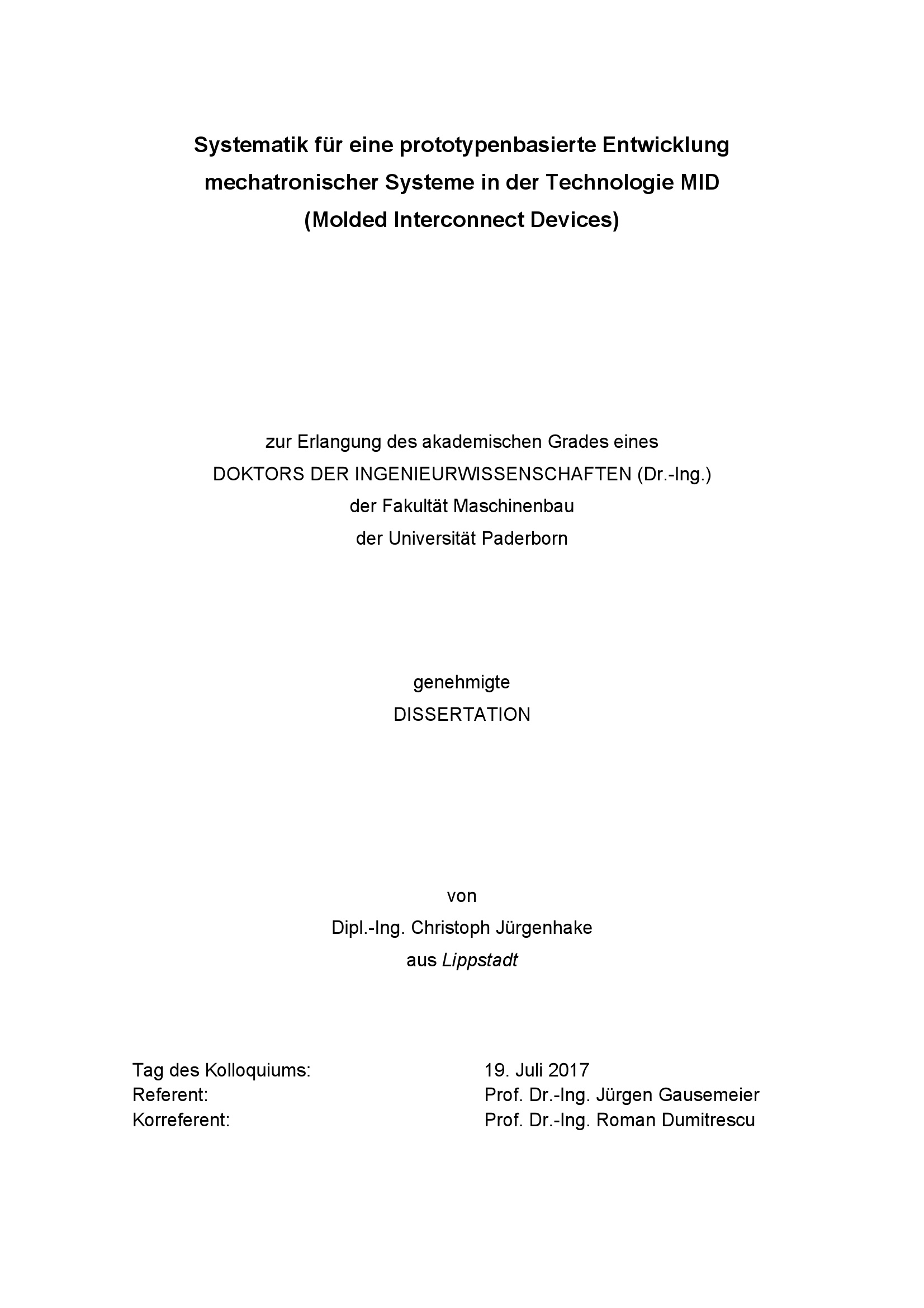 Systematik für eine prototypenbasierte Entwicklung mechatronischer Systeme in der Technologie MID (Molded Interconnect Devices) / von Dipl.-Ing. Christoph Jürgenhake ; Referent: Prof. Dr.-Ing. Jürgen Gausemeier, Korreferent: Prof. Dr.-Ing. Roman Dumitrescu