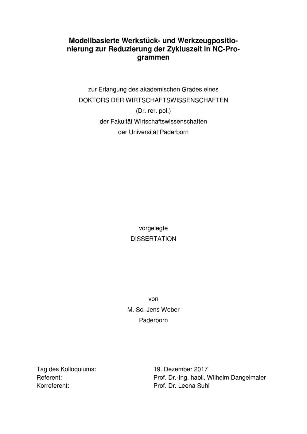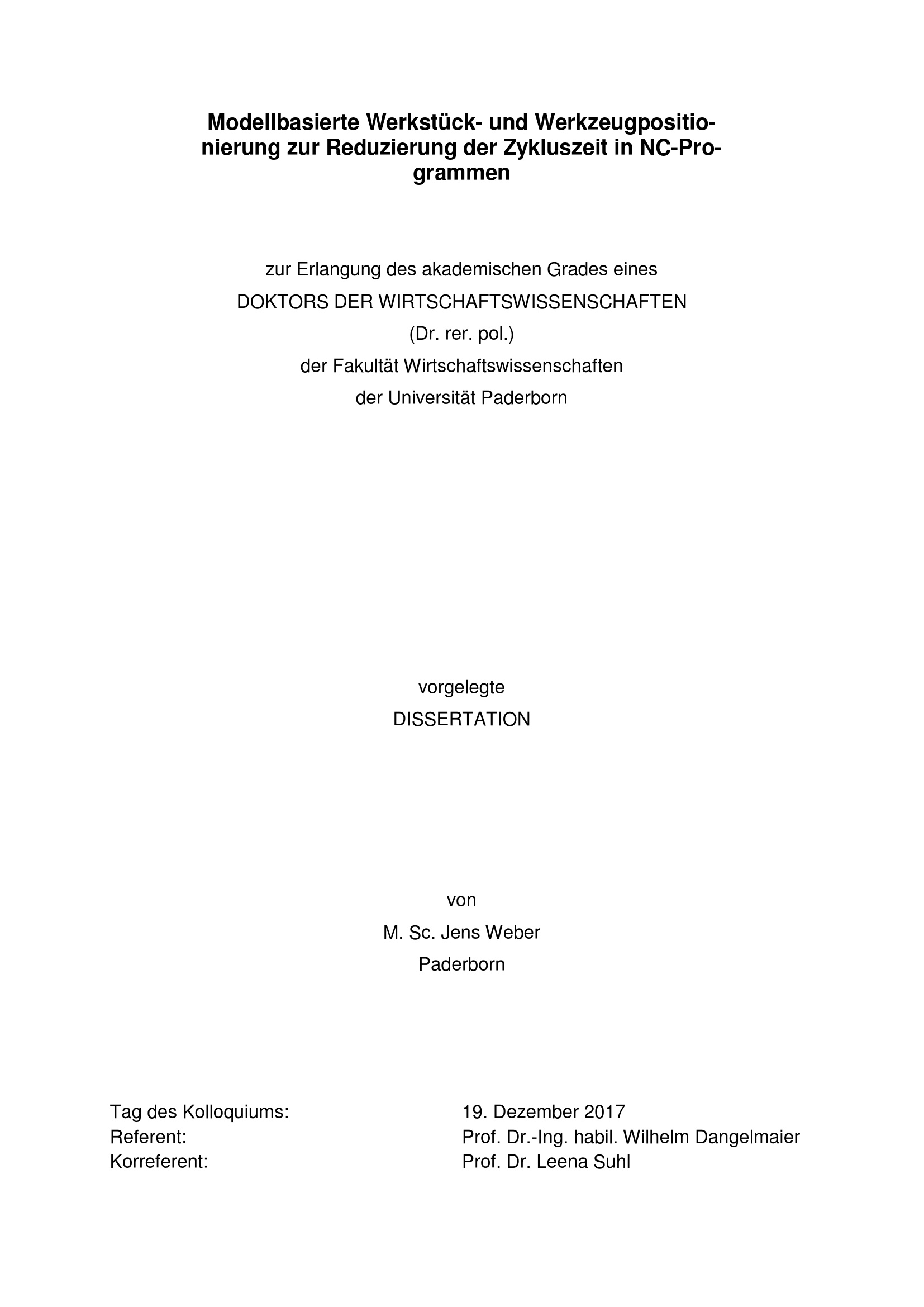 Modellbasierte Werkstück- und Werkzeugpositionierung zur Reduzierung der Zykluszeit in NC-Programmen / von M. Sc. Jens Weber ; Referent: Prof. Dr.-Ing. habil. Wilhelm Dangelmaier, Korreferent: Prof. Dr. Leena Suhl