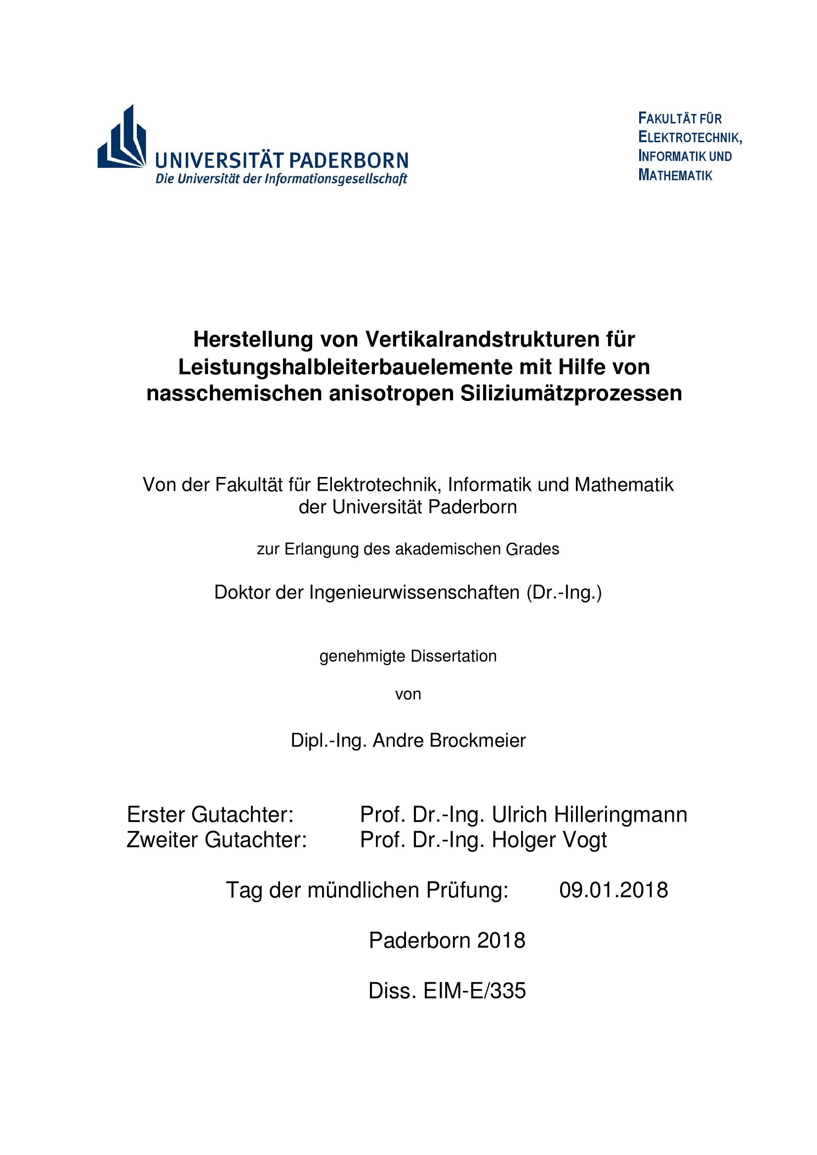Herstellung von Vertikalrandstrukturen für Leistungshalbleiterbauelemente mit Hilfe von nasschemischen anisotropen Siliziumätzprozessen / von Dipl.-Ing. Andre Brockmeier ; Erster Gutachter: Prof. Dr.-Ing. Ulrich Hilleringmann, Zweiter Gutachter: Prof. Dr.-Ing. Holger Vogt