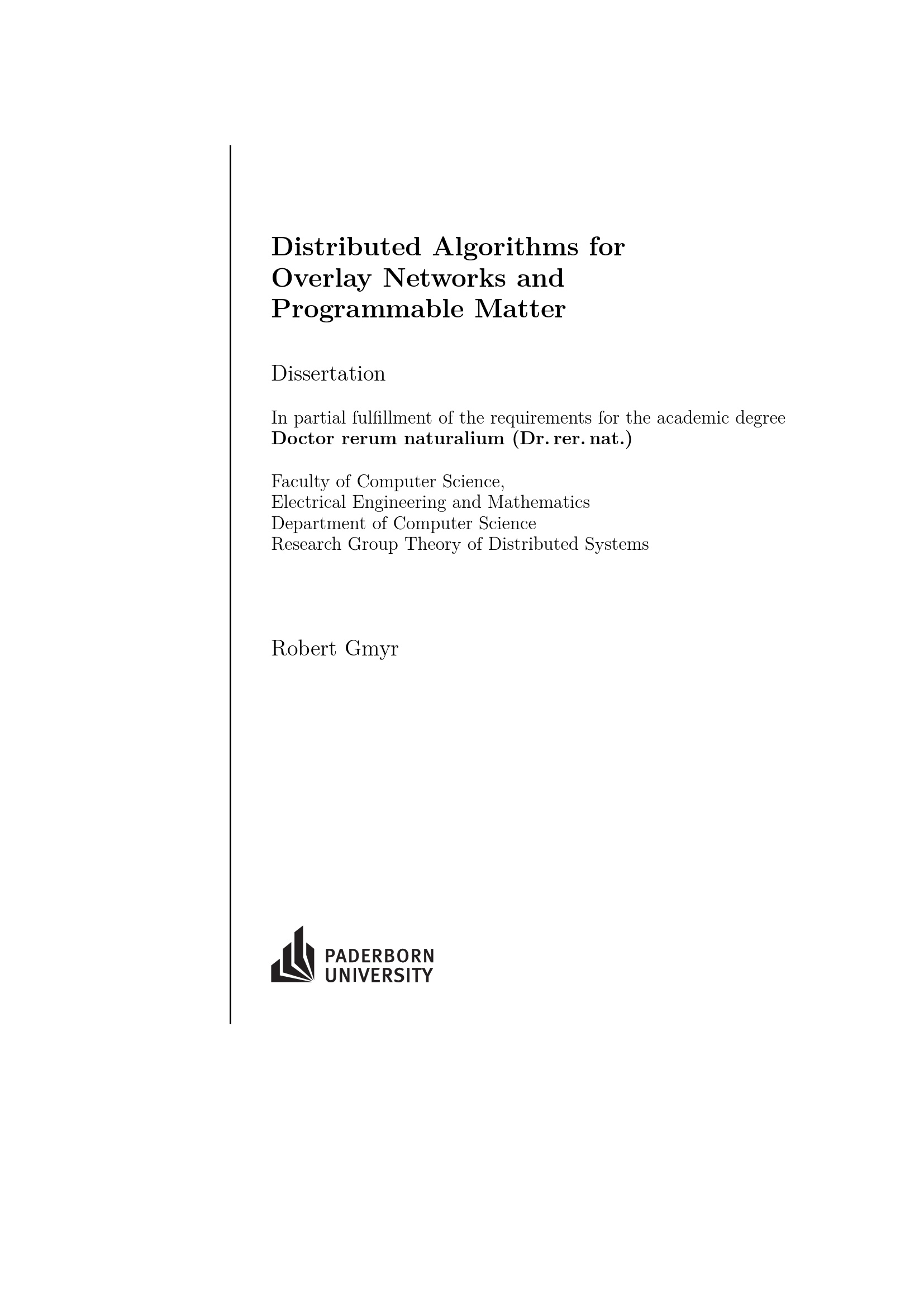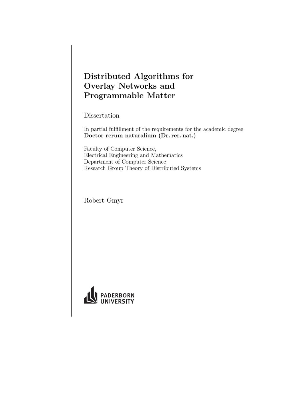 Distributed algorithms for overlay networks and programmable matter / Robert Gmyr ; [Reviewers: Christian Scheideler, Paderborn University, Friedhelm Meyer auf der Heide, Paderborn University, Andréa W. Richa, Arizona State University]