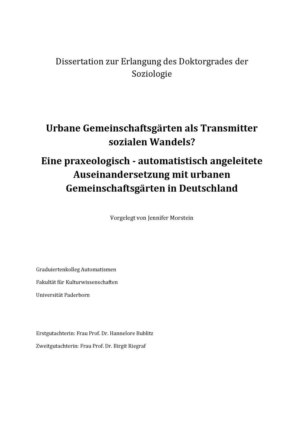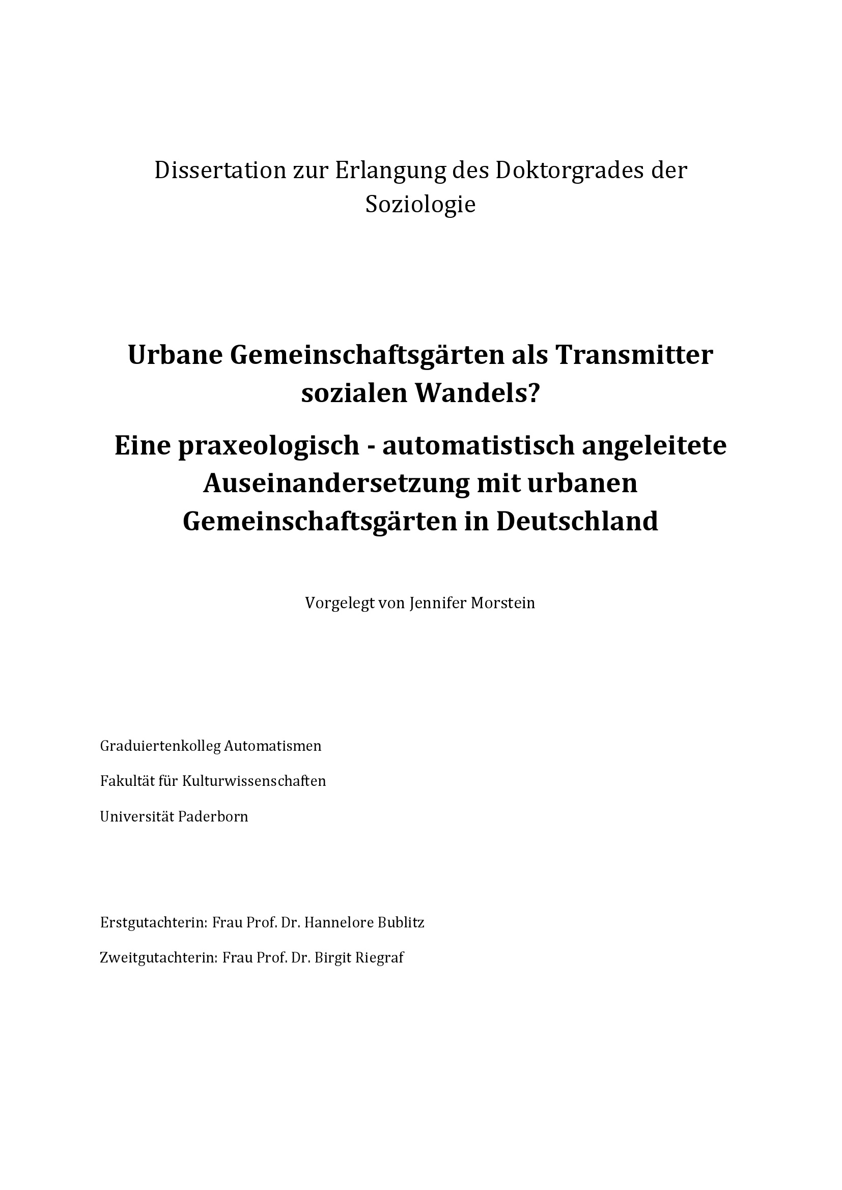 Urbane Gemeinschaftsgärten als Transmitter sozialen Wandels? : eine praxeologisch-automatistisch angeleitete Auseinandersetzung mit urbanen Gemeinschaftsgärten in Deutschland / vorgelegt von Jennifer Morstein ; Erstgutachterin: Frau Prof. Dr. Hannelore Bubitz, Zweitgutachterin: Frau Prof. Dr. Birgit Riegraf