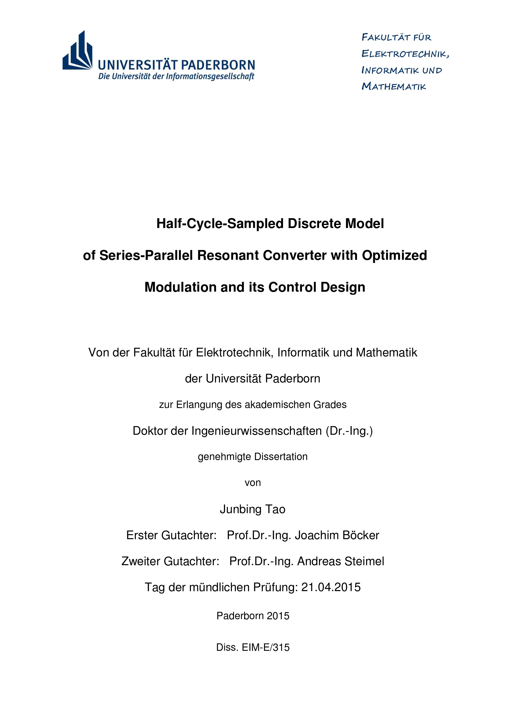 Half-cycle-sampled discrete model of series-parallel resonant converter with optimized modulation and its control design / von Junbing Tao ; Erster Gutachter: Prof. Dr.-Ing. Joachim Böcker, Zweiter Gutachter: Prof. Dr.-Ing. Andreas Steimel