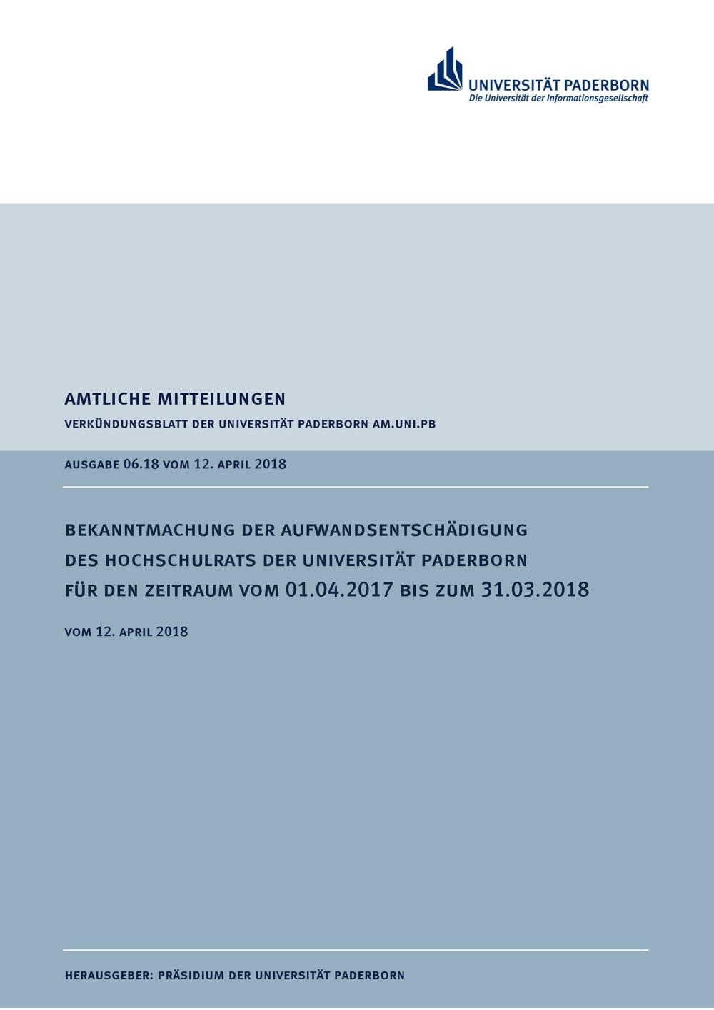 Bekanntmachung der Aufwandsentschädigung des Hochschulrats der Universität Paderborn für den Zeitraum vom 01.04.2017 bis zum 31.03.2018 : vom 12. April 2018