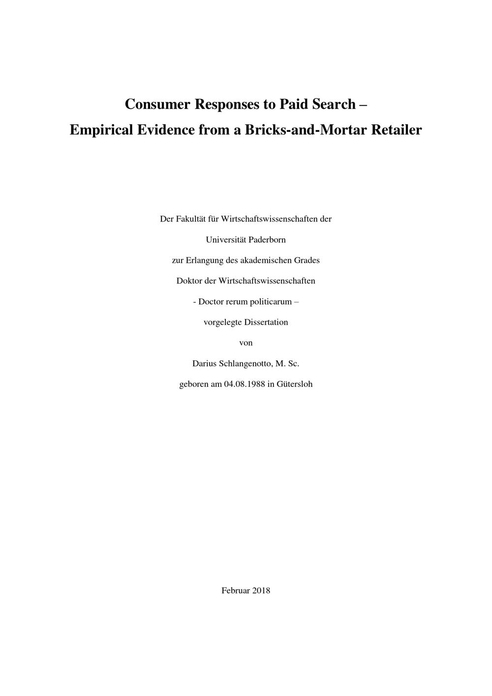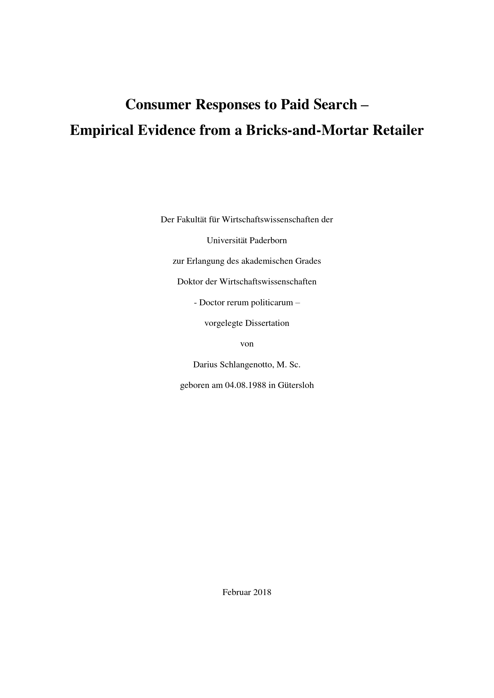 Consumer responses to paid search : empirical evidence from a bricks-and-mortar retailer / von Darius Schlangenotto ; supervisor: Prof. Dr. Dennis Kundisch, Prof. Dr. Nancy Wünderlich