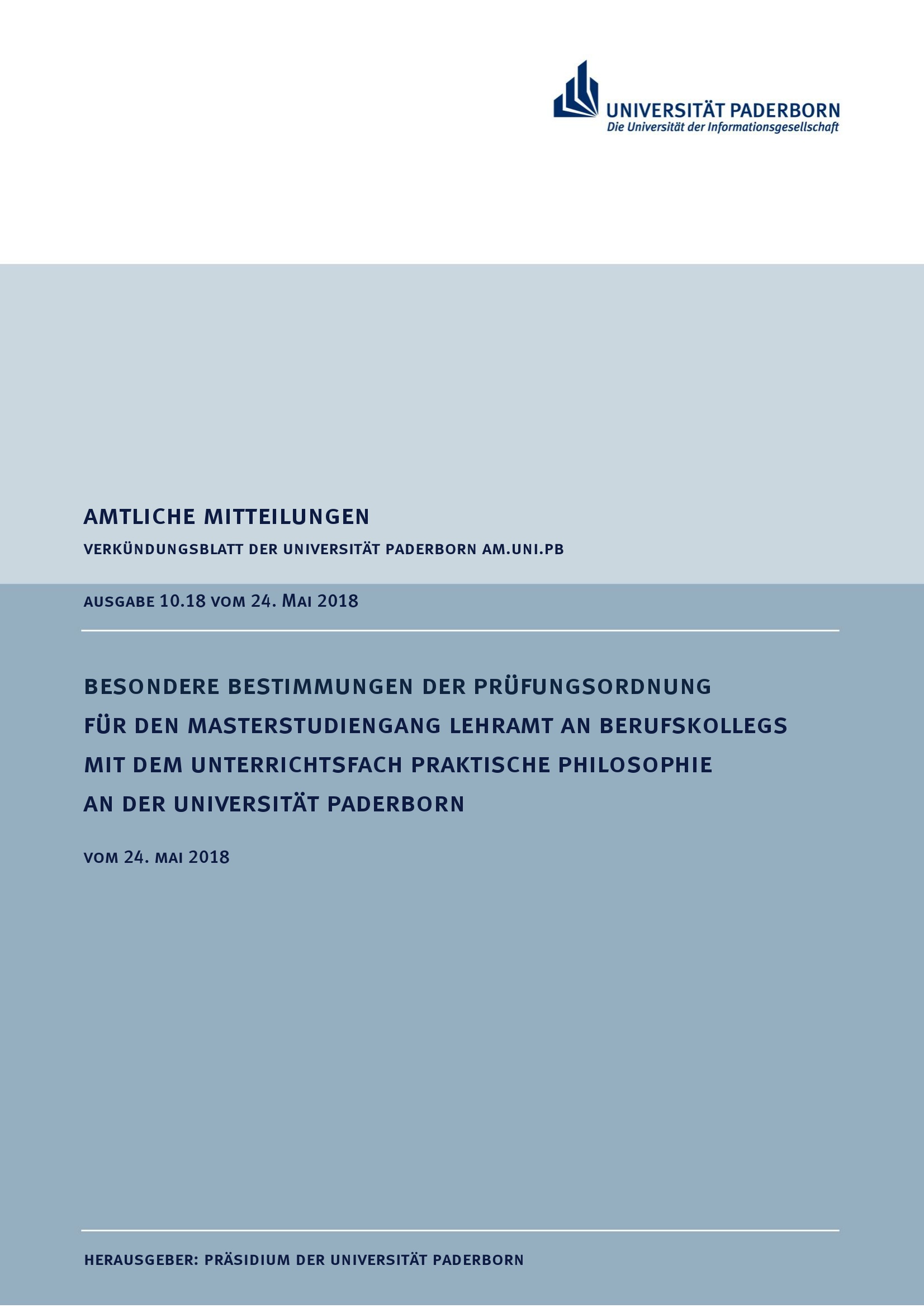 Besondere Bestimmungen der Prüfungsordnung für den Masterstudiengang Lehramt an Berufskollegs mit dem Unterrichtsfach Praktische Philosophie an der Universität Paderborn : vom 24. Mai 2018