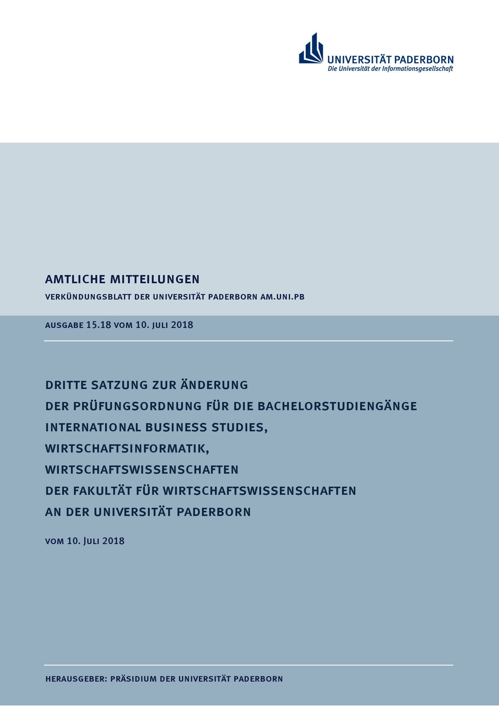 Dritte Satzung zur Änderung der Prüfungsordnung für die Bachelorstudiengänge International Business Studies, Wirtschaftsinformatik, Wirtschaftswissenschaften der Fakultät für Wirtschaftswissenschaften an der Universität Paderborn : vom 10. Juli 2018