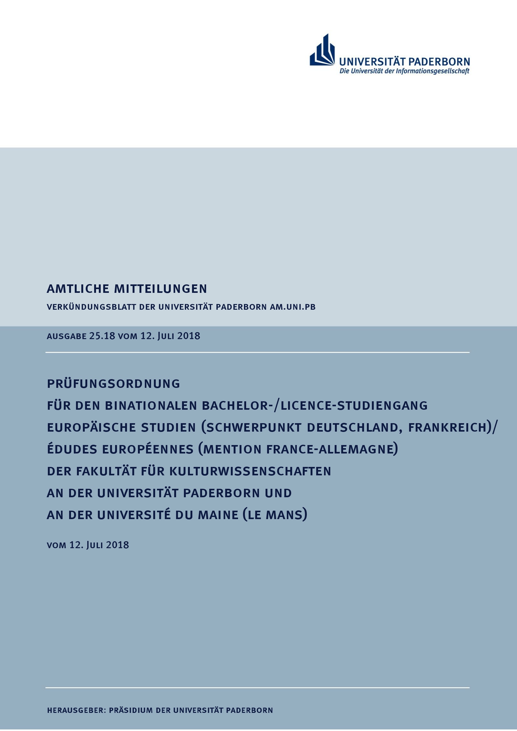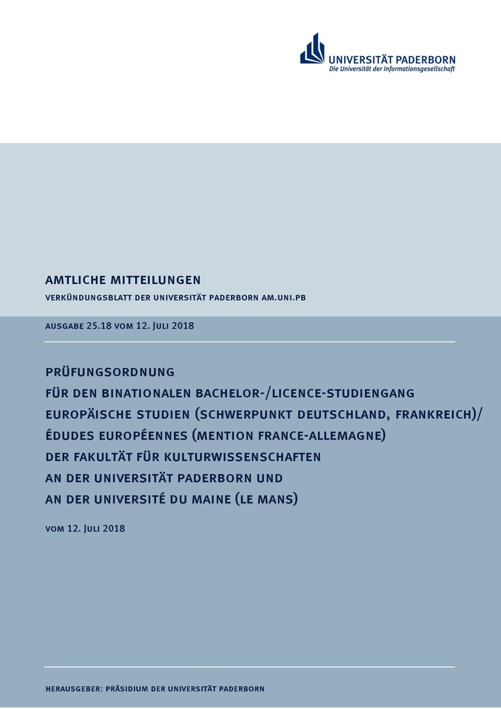 Prüfungsordnung für den binationalen Bachelor-/Licence-Studiengang Europäische Studien (Schwerpunkt Deutschland, Frankreich)/Édudes Européennes (Mention France-Allemagne) der Fakultät für Kulturwissenschaften an der Universität Paderborn und an der Université du Maine (Le Mans) : vom 12. Juli 2018
