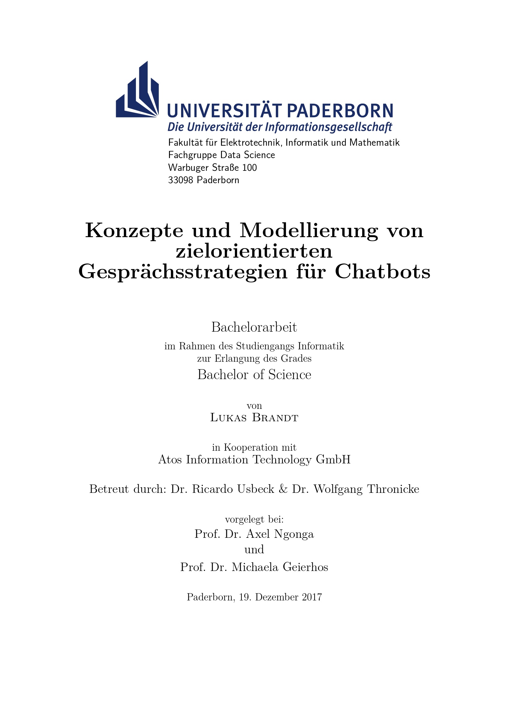 Konzepte und Modellierung von zielorientierten Gesprächsstrategien für Chatbots / von Lukas Brandt ; betreut durch: Dr. Ricardo Usbeck & Dr. Wolfgang Thronicke ; vorgelegt bei Prof. Dr. Axel Ngonga und Prof. Dr. Michaela Geierhos