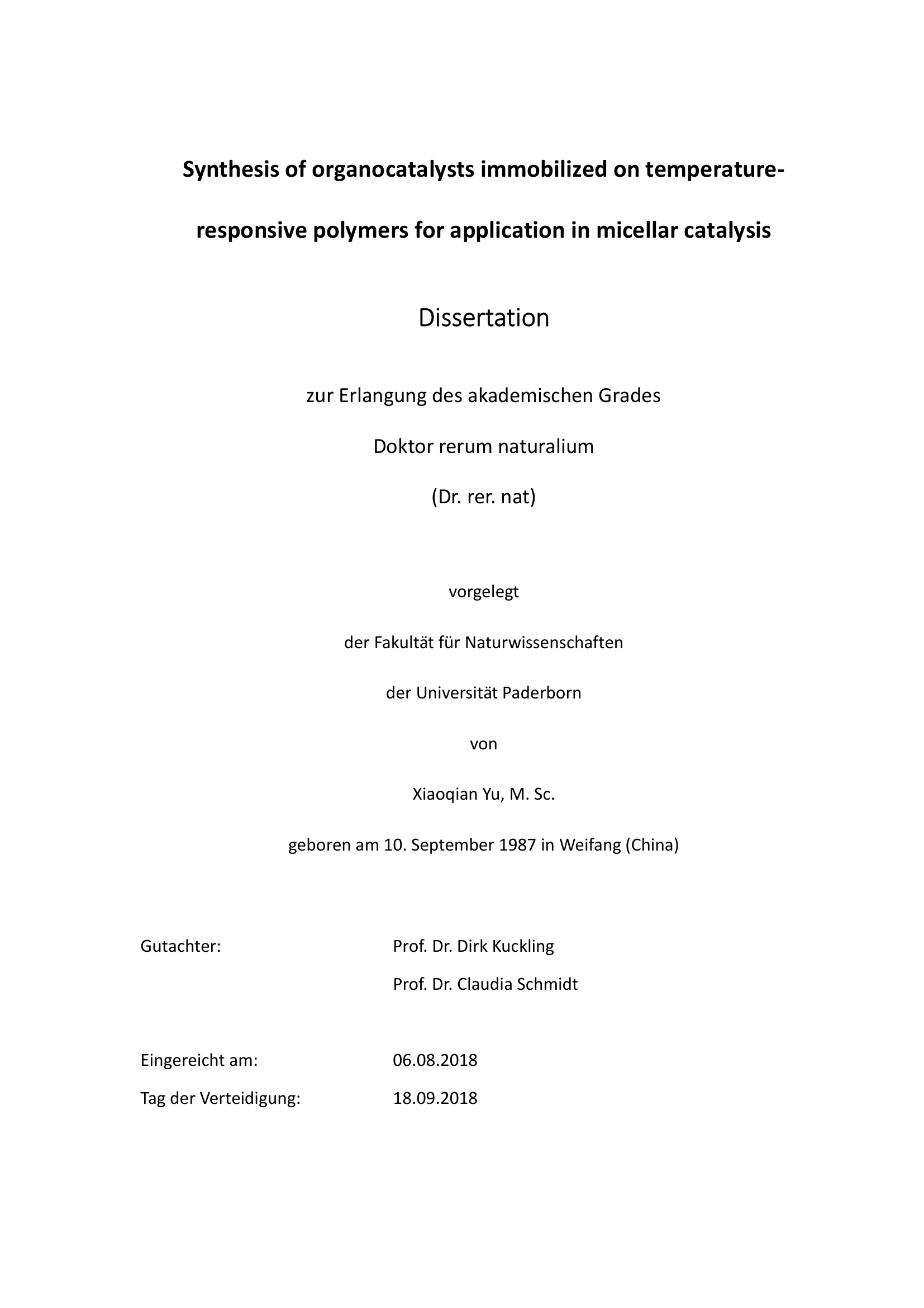 Synthesis of organocatalysts immobilized on temperatureresponsive polymers for application in micellar catalysis / von Xiaoqian Yu, M. Sc. ; Gutachter: Prof. Dr. Dirk Kuckling, Prof. Dr. Claudia Schmidt