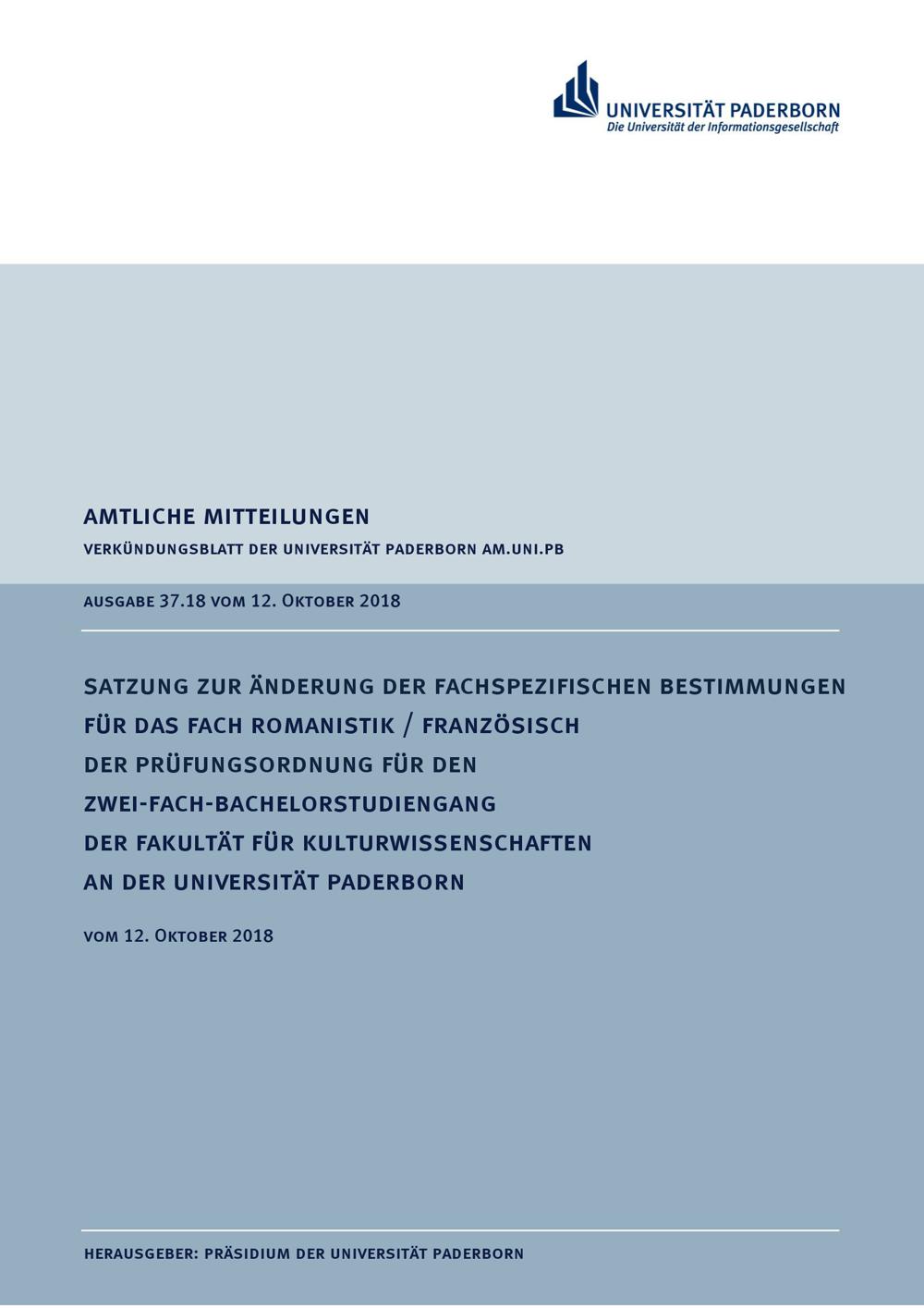 Satzung zur Änderung der fachspezifischen Bestimmungen für das Fach Romanistik / Französisch der Prüfungsordnung für den Zwei-Fach-Bachelorstudiengang der Fakultät für Kulturwissenschaften an der Universität Paderborn : vom 12. Oktober 2018