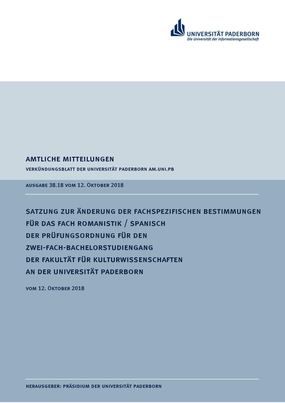 Satzung zur Änderung der fachspezifischen Bestimmungen für das Fach Romanistik / Spanisch der Prüfungsordnung für den Zwei-Fach-Bachelorstudiengang der Fakultät für Kulturwissenschaften an der Universität Paderborn : vom 12. Oktober 2018