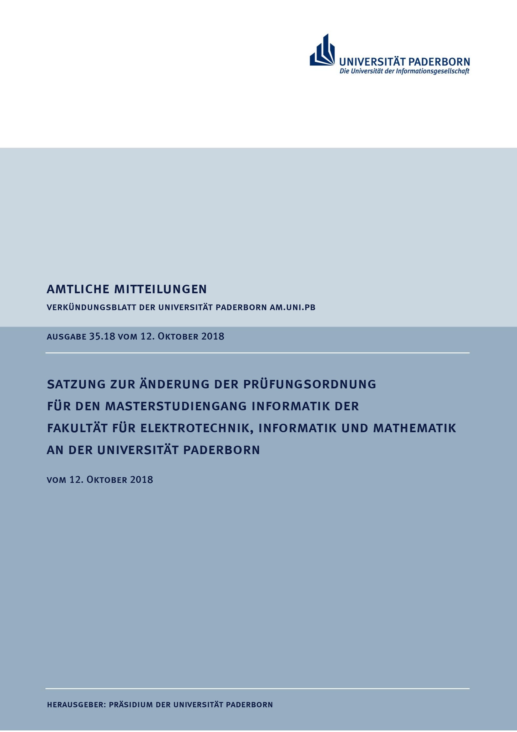 Satzung zur Änderung der Prüfungsordnung für den Masterstudiengang Informatik der Fakultät für Elektrotechnik, Informatik und Mathematik an der Universität Paderborn : vom 12. Oktober 2018