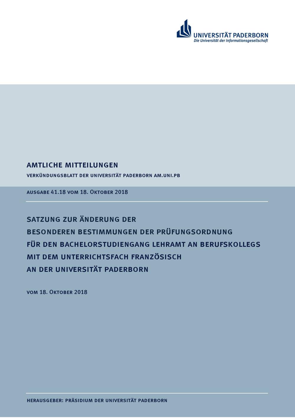 Satzung zur Änderung der Besonderen Bestimmungen der Prüfungsordnung für den Bachelorstudiengang Lehramt an Berufskollegs mit dem Unterrichtsfach Französisch an der Universität Paderborn : vom 18. Oktober 2018