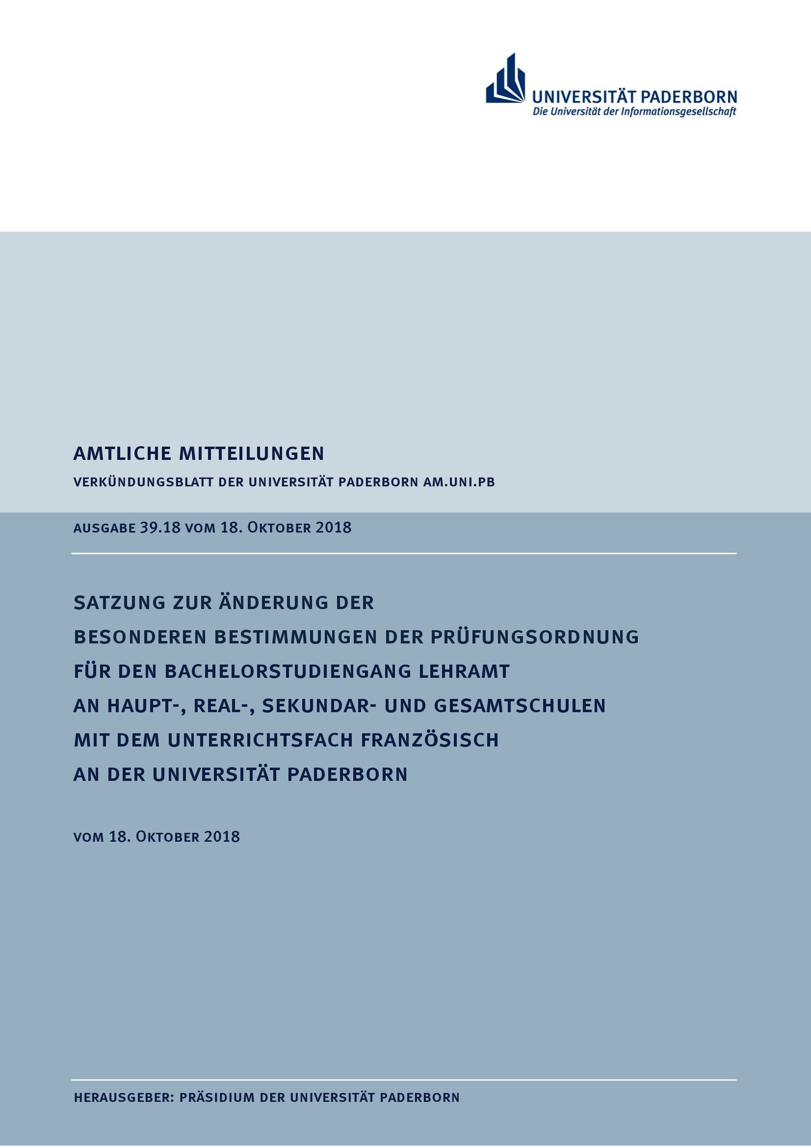 Satzung zur Änderung der Besonderen Bestimmungen der Prüfungsordnung für den Bachelorstudiengang Lehramt an Haupt-, Real-, Sekundar- und Gesamtschulen mit dem Unterrichtsfach Französisch an der Universität Paderborn : vom 18. Oktober 2018