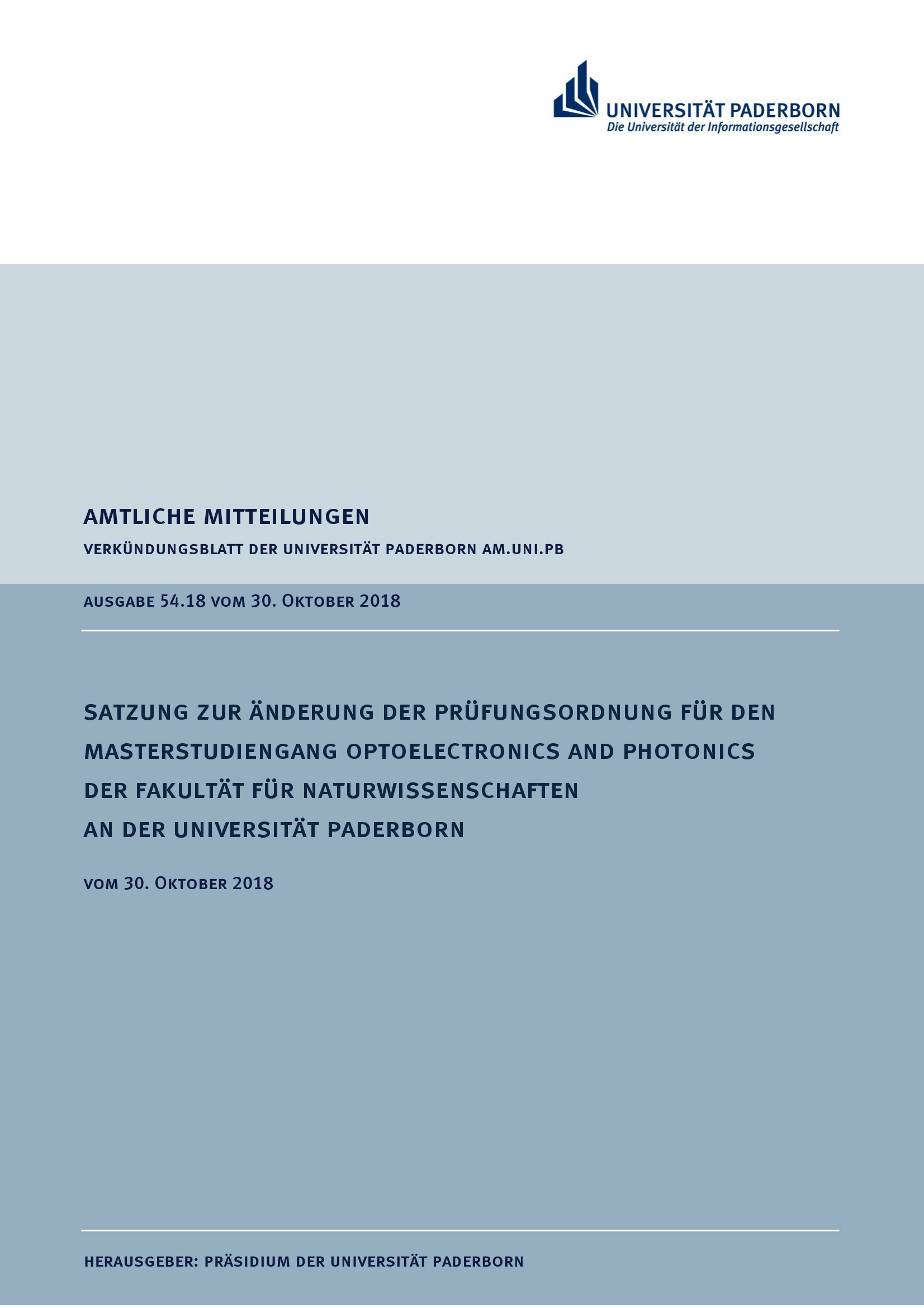 Satzung zur Änderung der Prüfungsordnung für den Masterstudiengang Optoelectronics and Photonics der Fakultät für Naturwissenschaften an der Universität Paderborn : vom 30. Oktober 2018