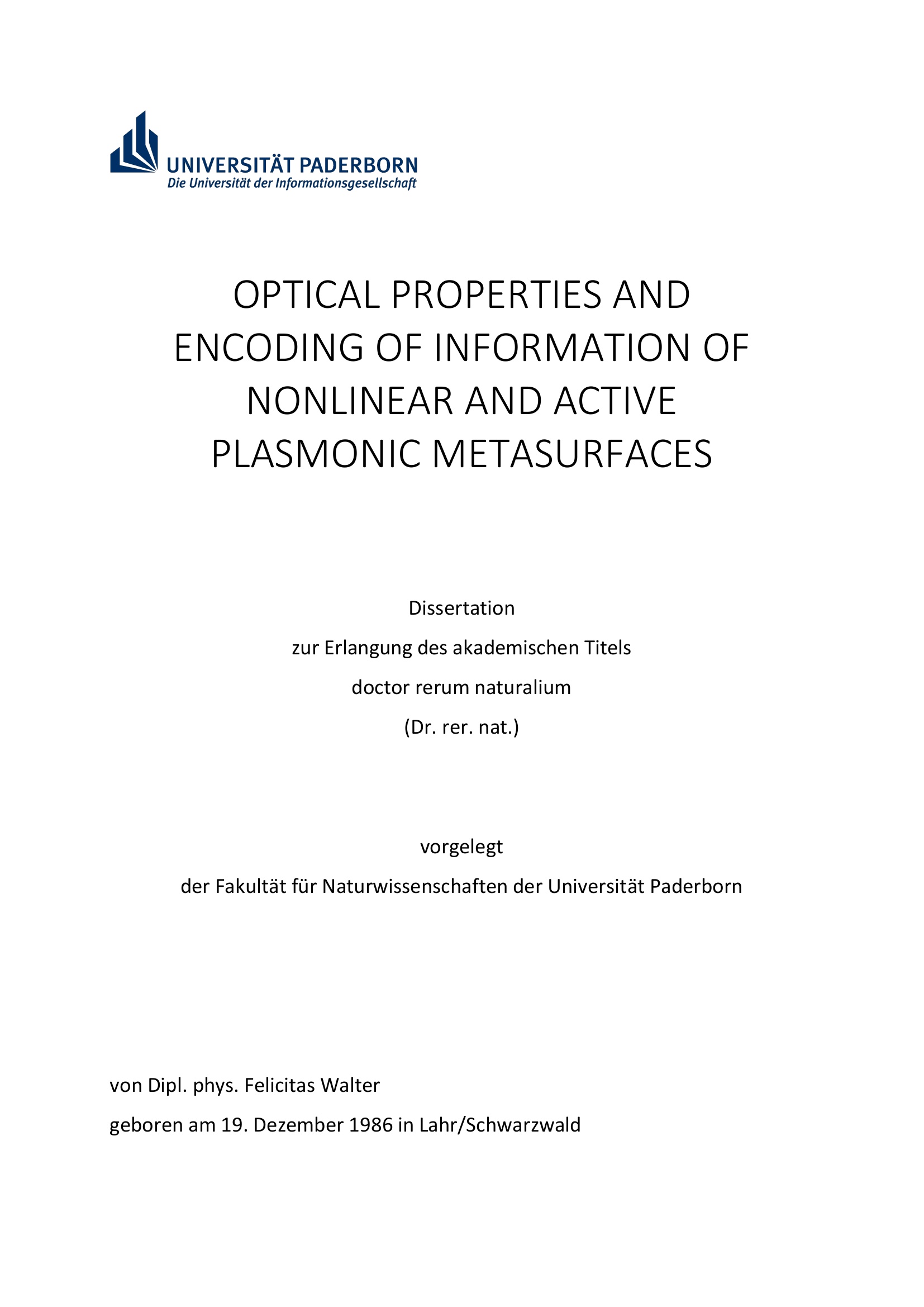 Optical properties and encoding of information of nonlinear and active plasmonic metasurfaces / von Dipl. phys. Felicitas Walter