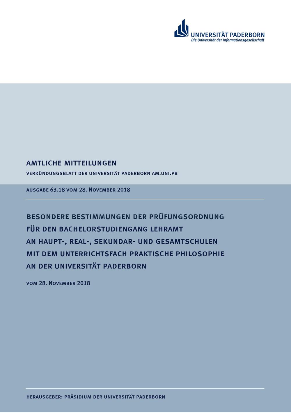 Besondere Bestimmungen der Prüfungsordnung für den Bachelorstudiengang Lehramt an Haupt-, Real-, Sekundar- und Gesamtschulen mit dem Unterrichtsfach Praktische Philosophie an der Universität Paderborn : vom 28. November 2018