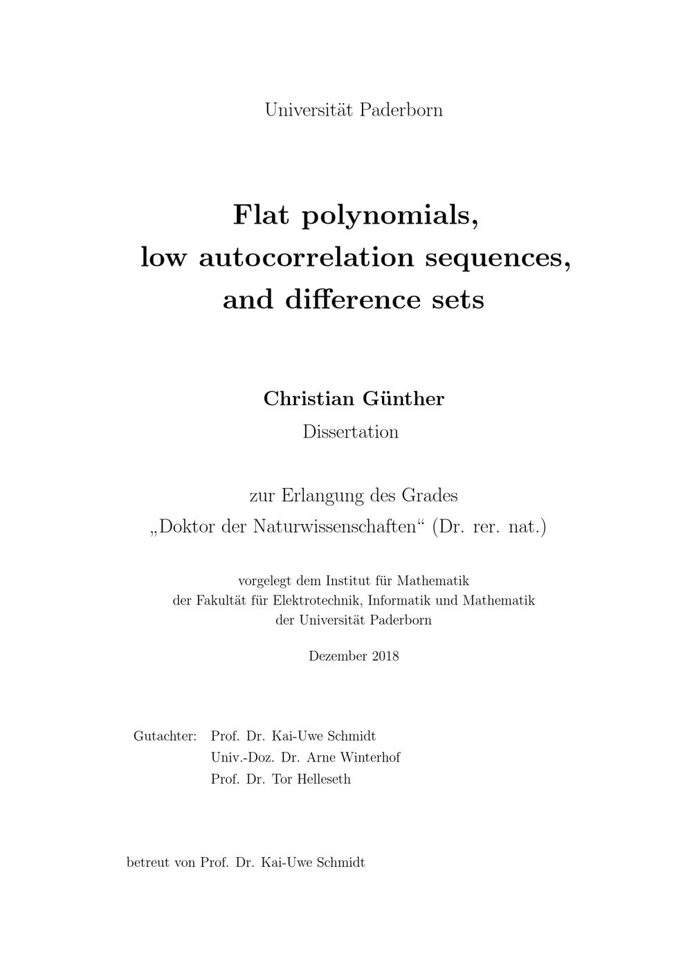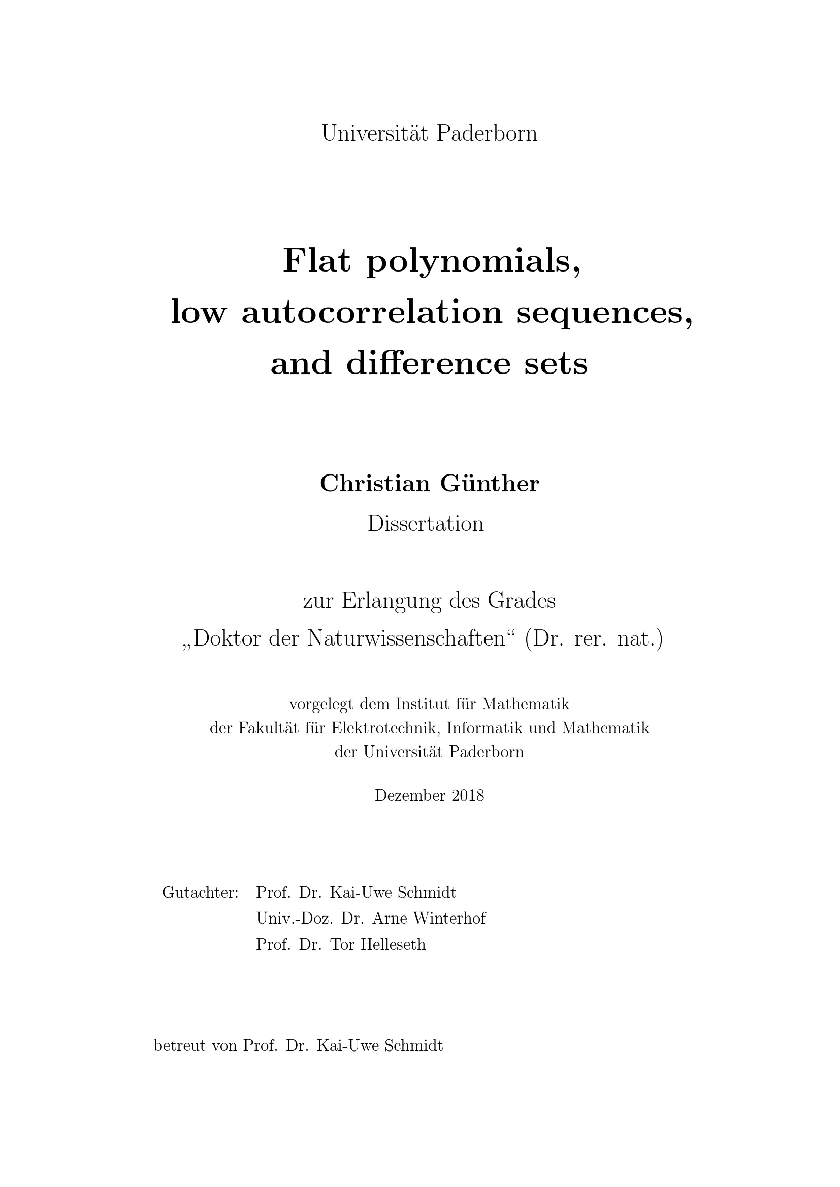 Flat polynomials, low autocorrelation sequences, and difference sets / Christian Günther ; Gutachter: Prof. Dr. Kai-Uwe Schmidt, Uni.-Doz. Dr. Arne Winterhof, Prof. Dr. Tor Helleseth