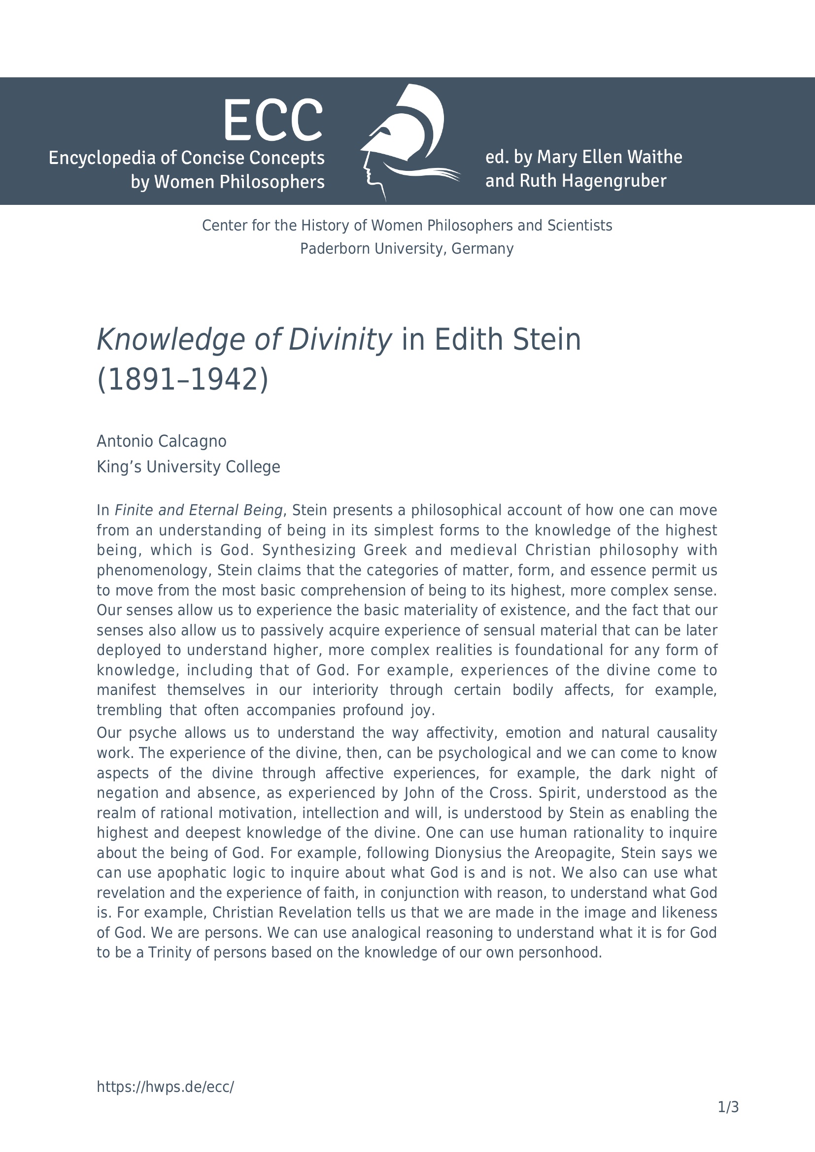 Knowledge of divinity in Edith Stein (1891-1942) / Antonio Calcagno, King's University College