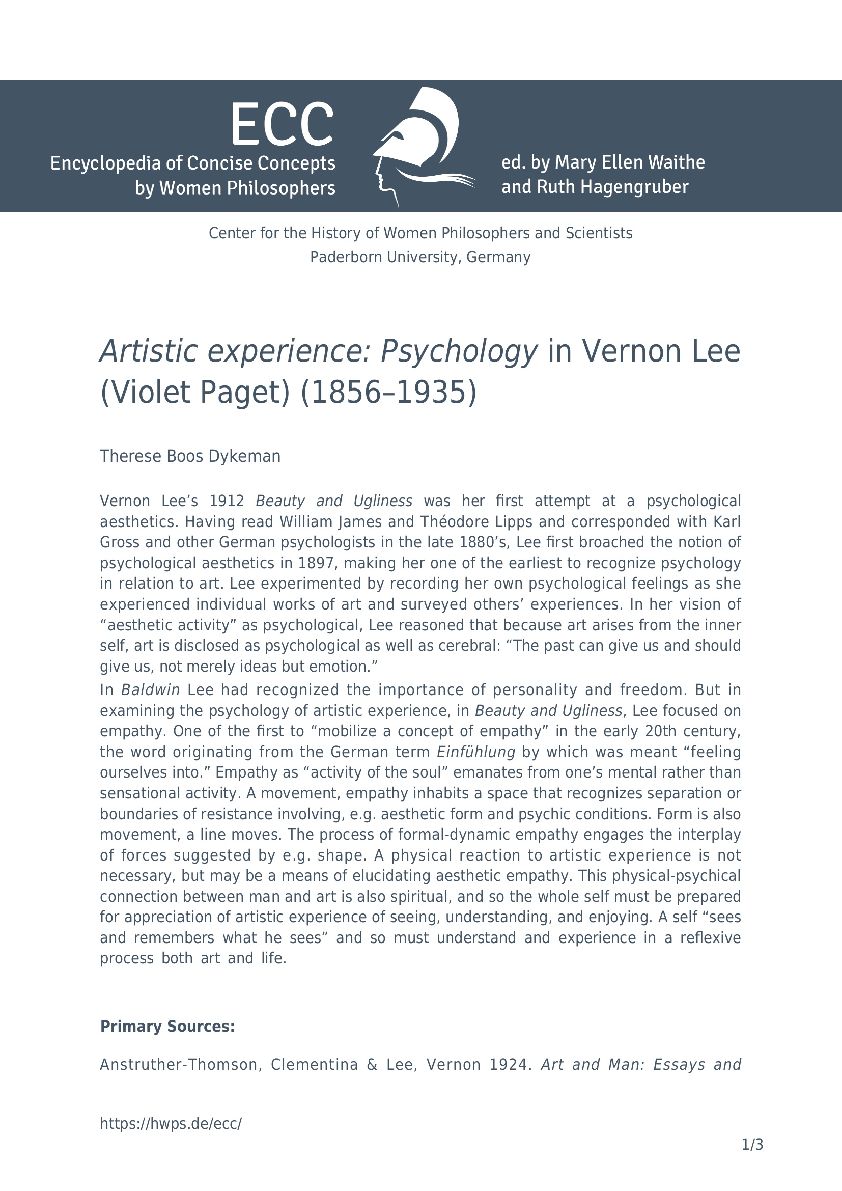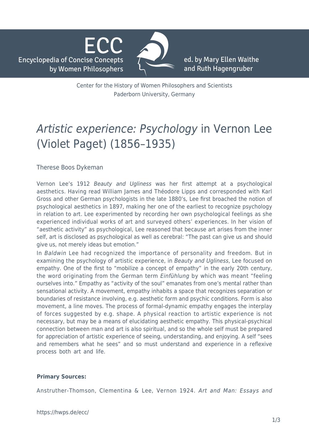 Artistic experience: psychology in Vernon Lee (Violet Paget) (1856-1935) / Therese Boos Dykeman