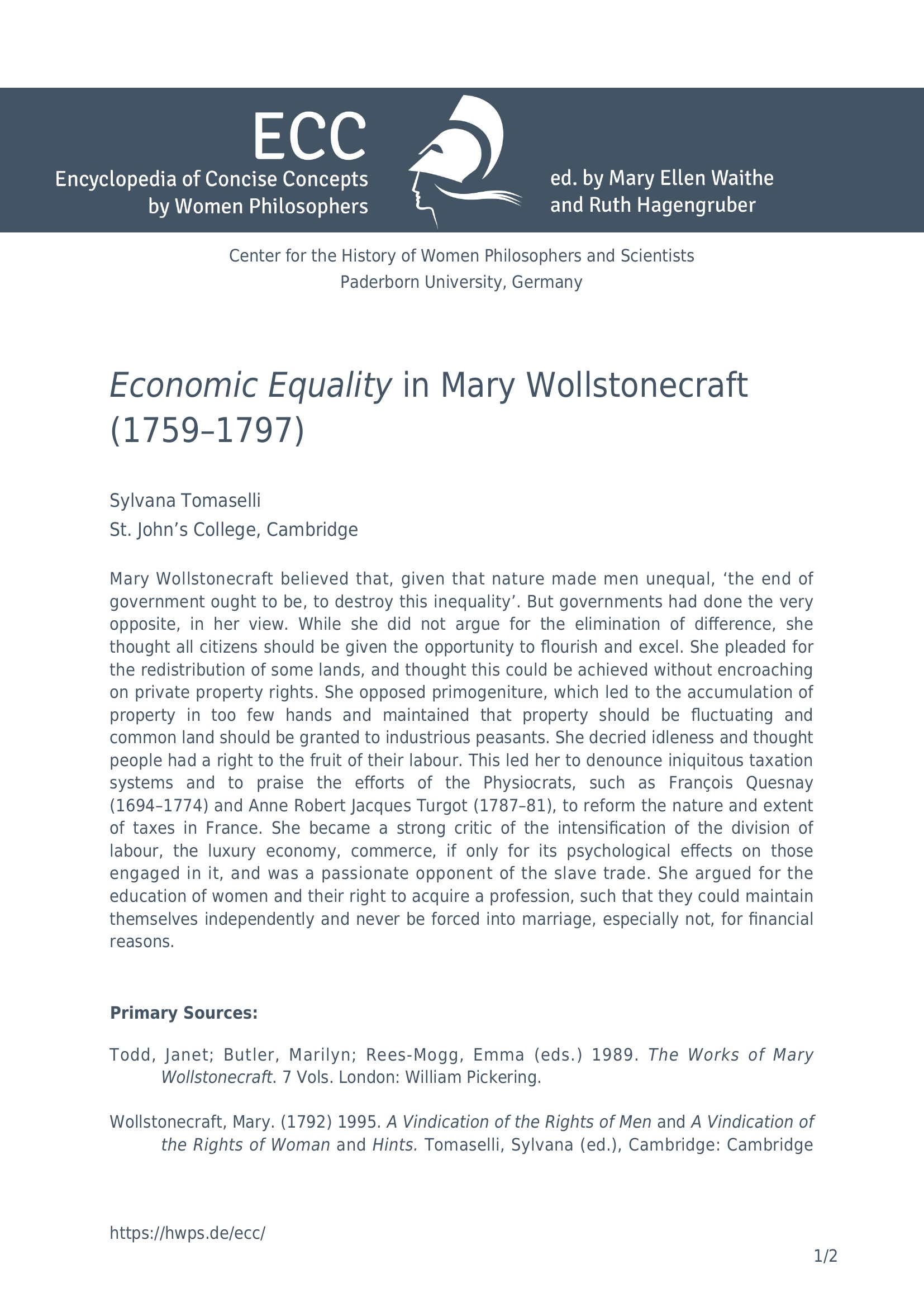 Economic equality in Mary Wollstonecraft (1759-1797) / Sylvana Tomaselli, St. John's College, Cambridge