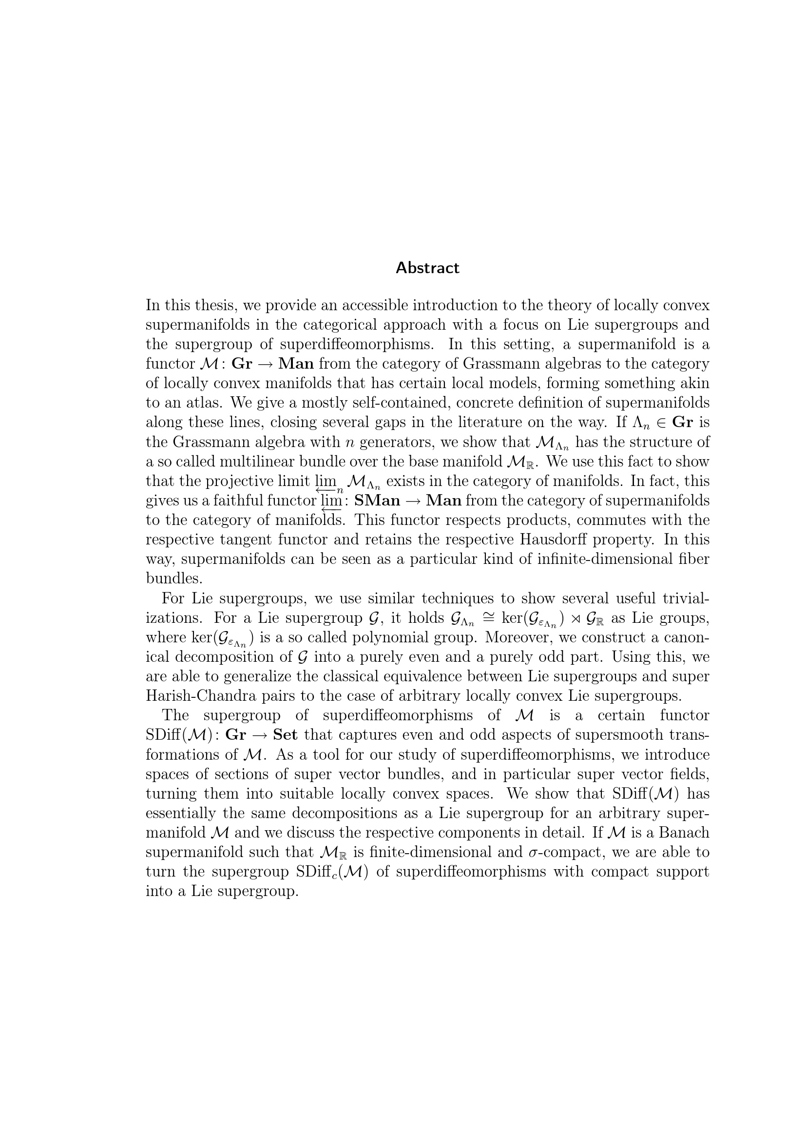 Infinite-dimensional supermanifolds, lie supergroups and the supergroup of superdiffeomorphisms / von Jakob Schütt ; [Betreuer: Prof. Dr. Helge Glöckner (Universität Paderborn), Prof. Dr. Joachim Hilgert (Universität Paderborn), Prof. Dr. Wolfgang Bertram (Université de Lorraine)]